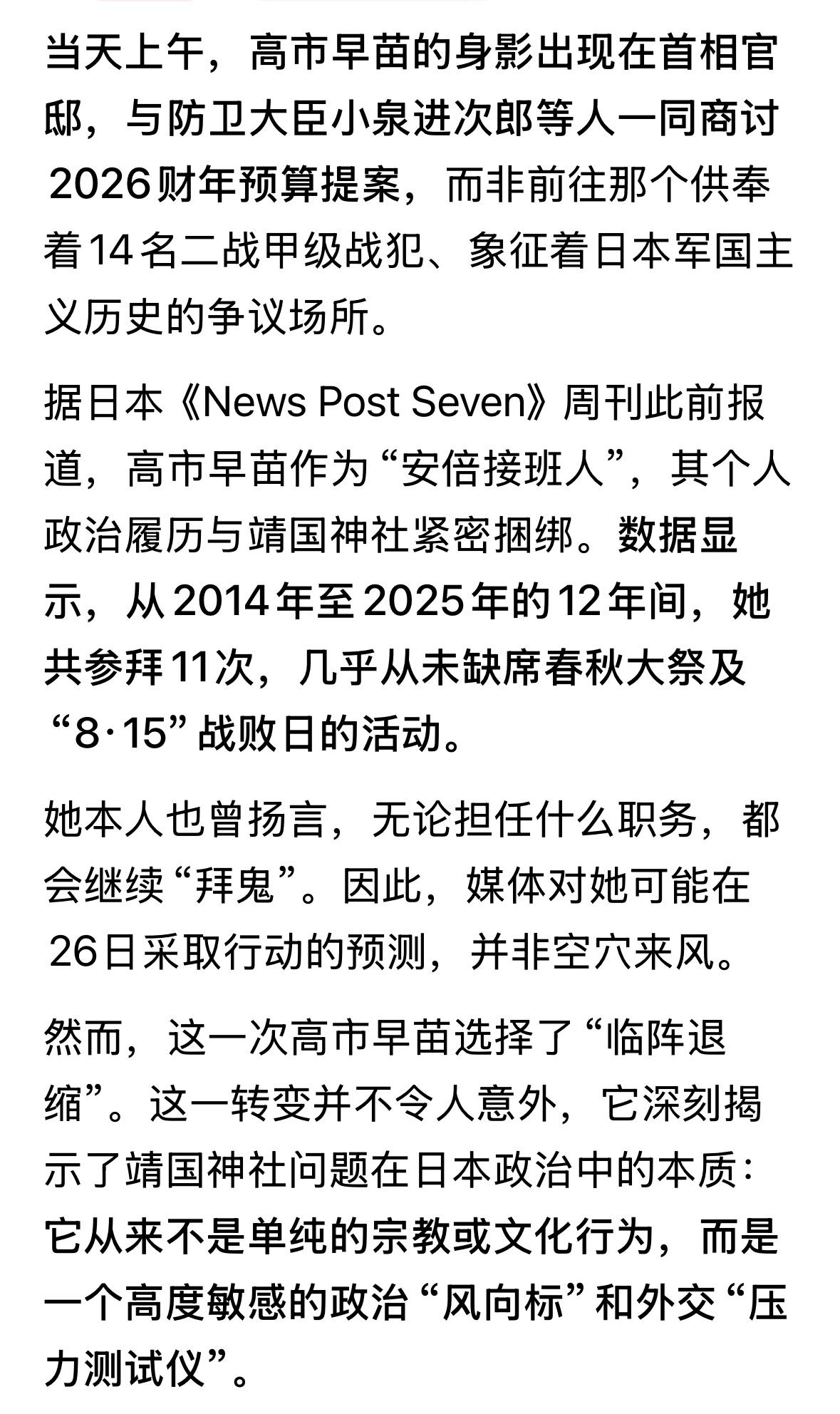 这是能搜到的最新消息,分析来看,应该没去,不敢去了!日本军国主义抬头,必然遭到世界反法西斯正义力量的坚决抵制,高市早苗胆敢才拜鬼,只能是抱起石头砸自己身上脚!#高市早苗##靖国神社#