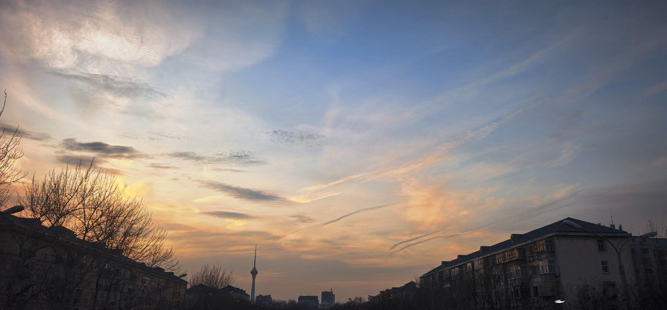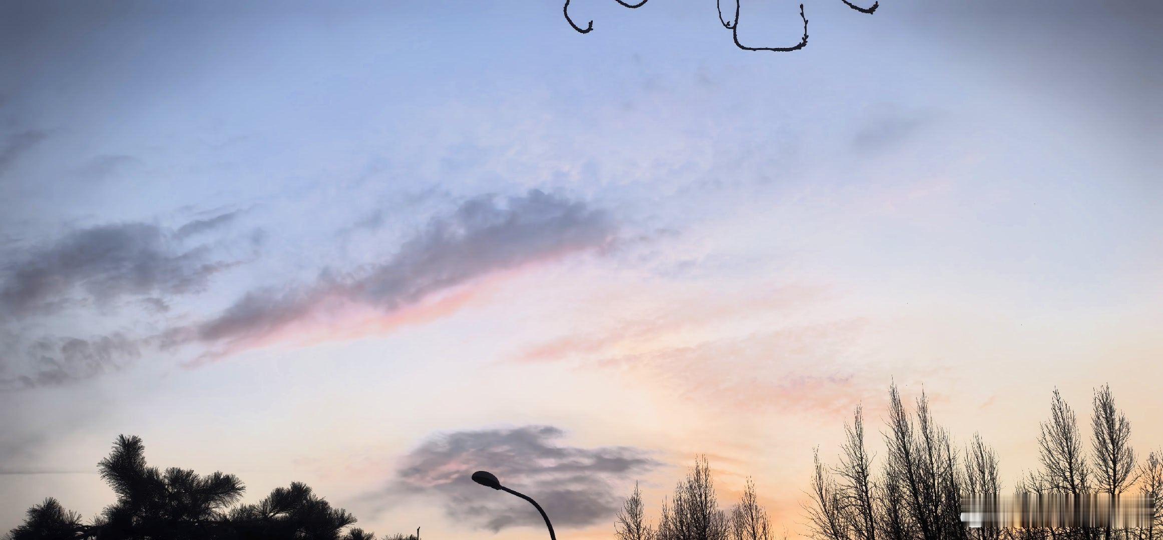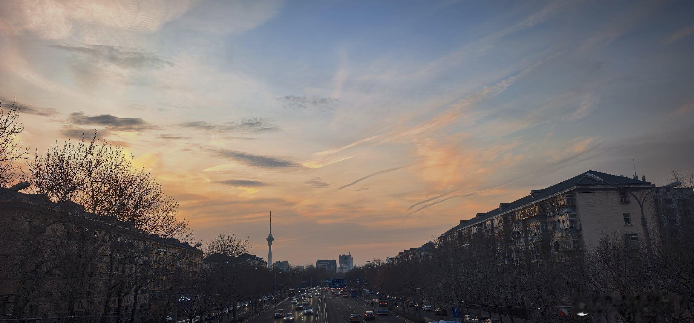 北京冬日周五的傍晚,晚霞不艳,云也不厚,风淡云轻的感觉,偶尔路过的一群高飞的不知