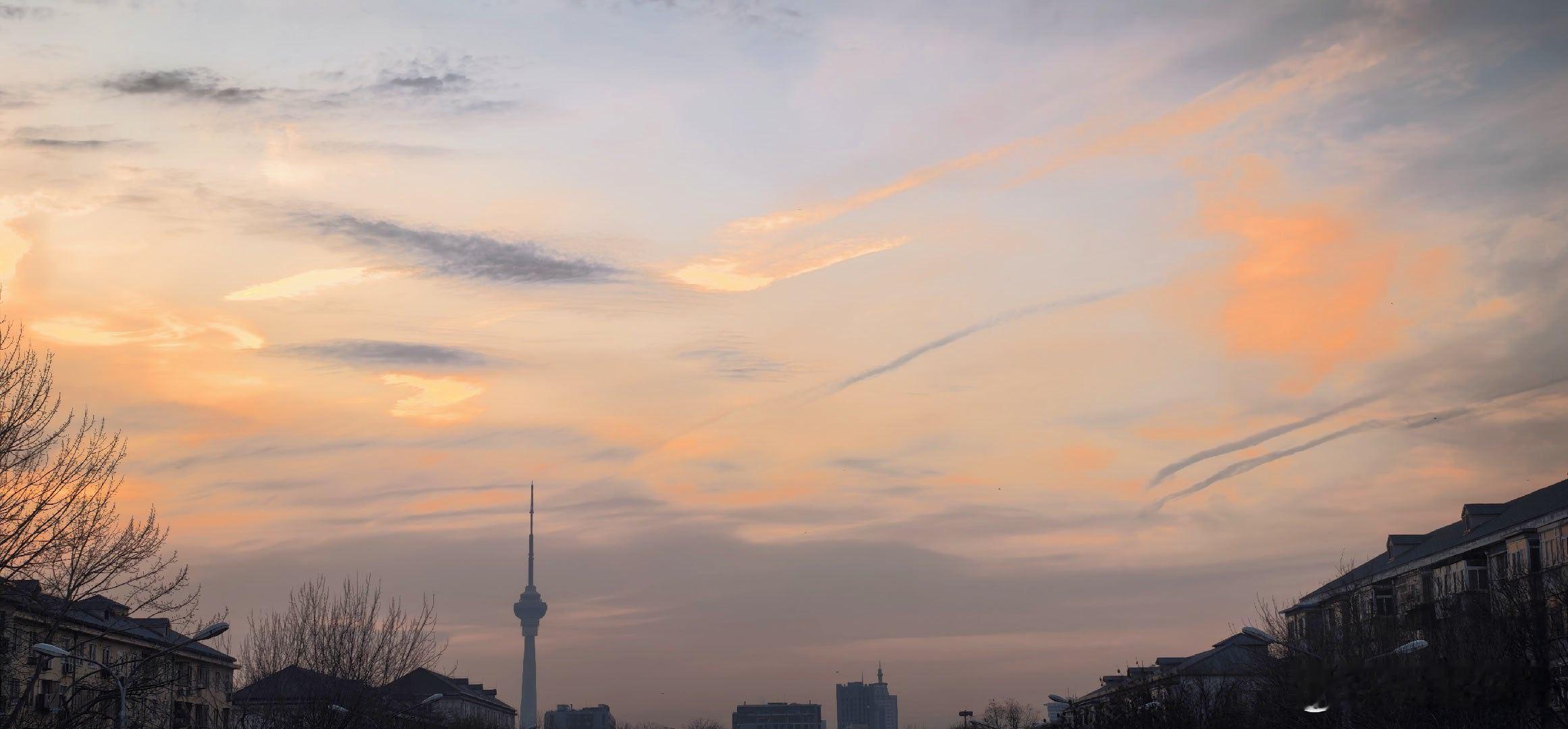 北京冬日周五的傍晚,晚霞不艳,云也不厚,风淡云轻的感觉,偶尔路过的一群高飞的不知名的鸟儿,瞬间让天空有了生机与活力。 北京你好 摄影