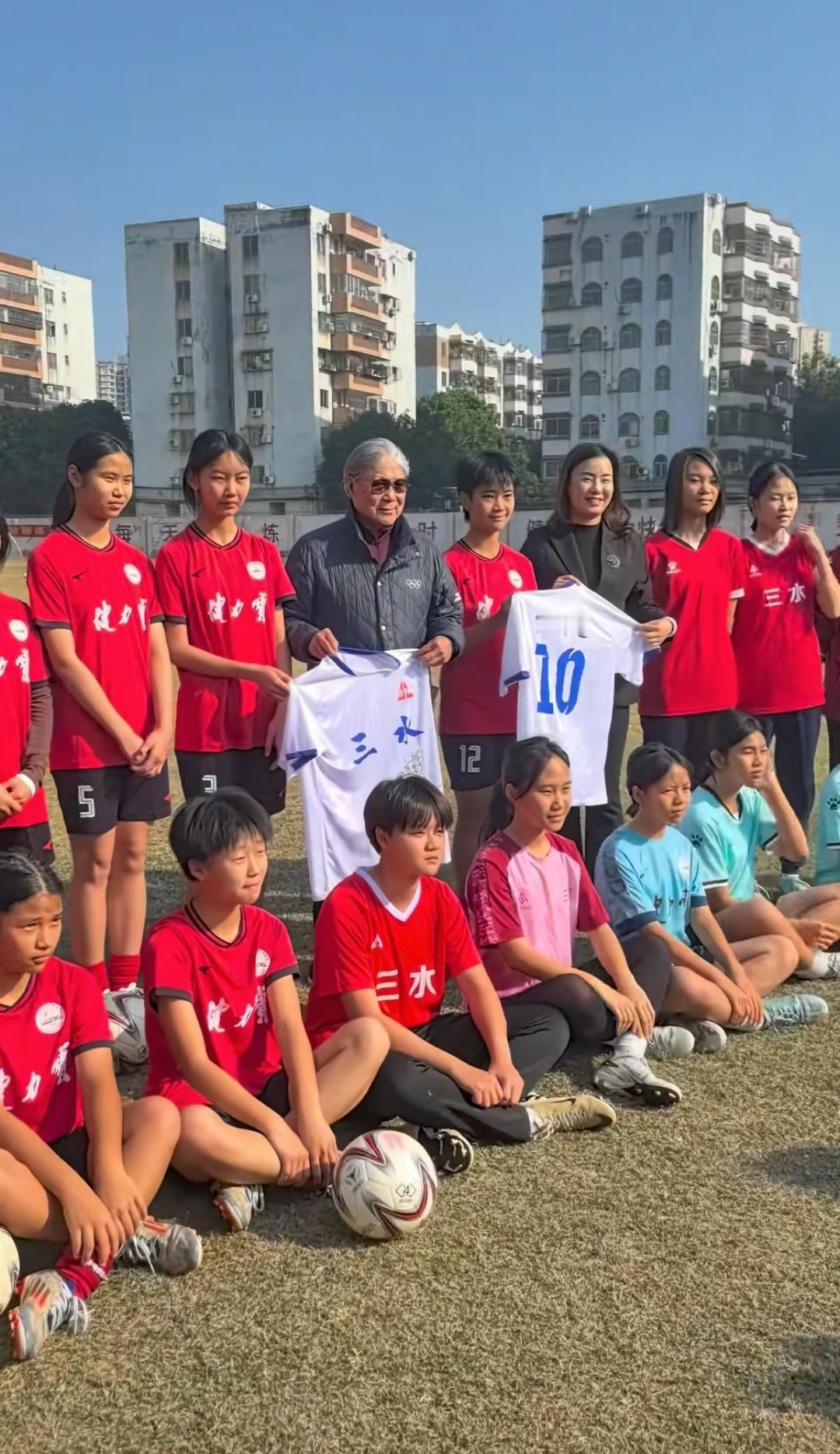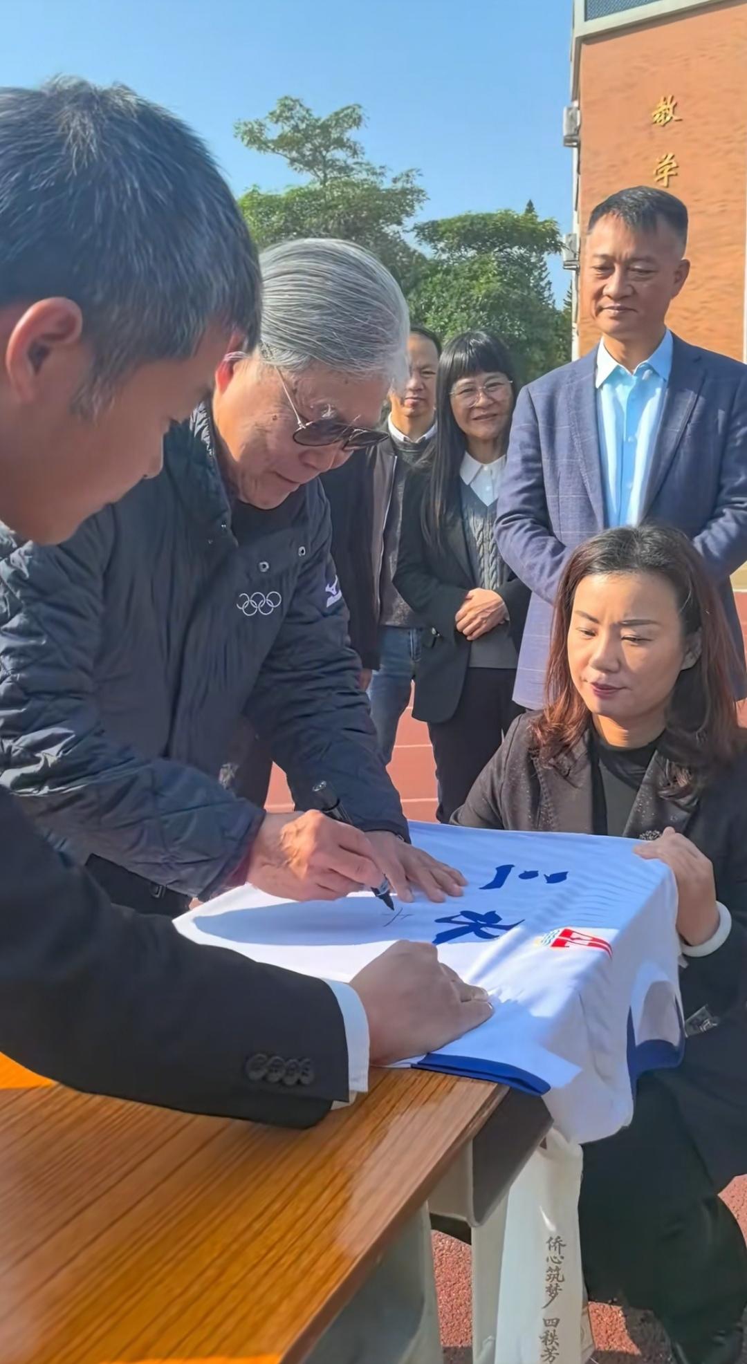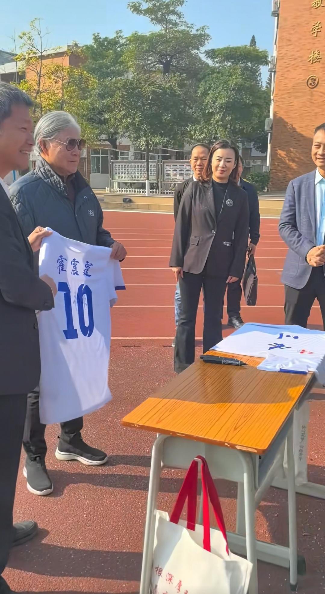 12月27日,霍震霆现身三水华侨中学,参加活动,看看学校的发展变化。 霍震霆在有关工作人员的陪同下来到了学校操场,学校准备了一件印有他名字的足球运动短袖,让霍老先生进行签名。 霍震霆签名后,与学校的足球队,以及老师们进行了合影。
