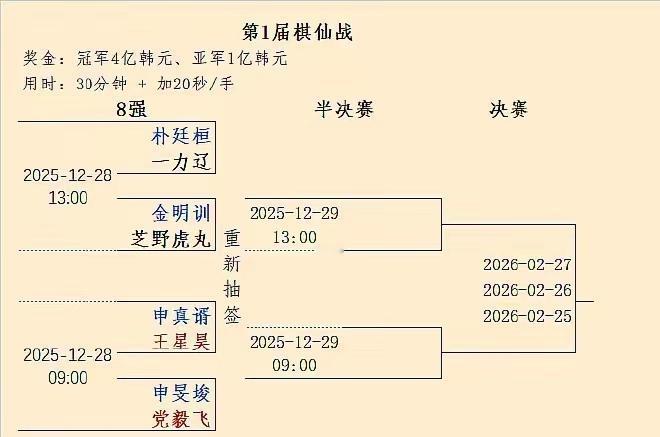 棋仙战八强战:中日韩2-2-4! 日本围棋终于支棱起来了!一力辽、芝野虎丸战胜对手晋级首届“棋仙战”八强,与中国队晋级人数相同,这是一个不小的进步! 28日进行1/4决赛,9点,申真谞对阵王星昊、党毅飞对阵申旻埈;13点,一力辽对阵朴廷桓、芝野虎丸对阵金明训。