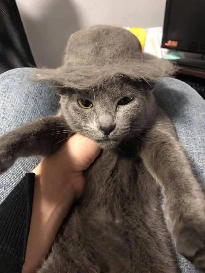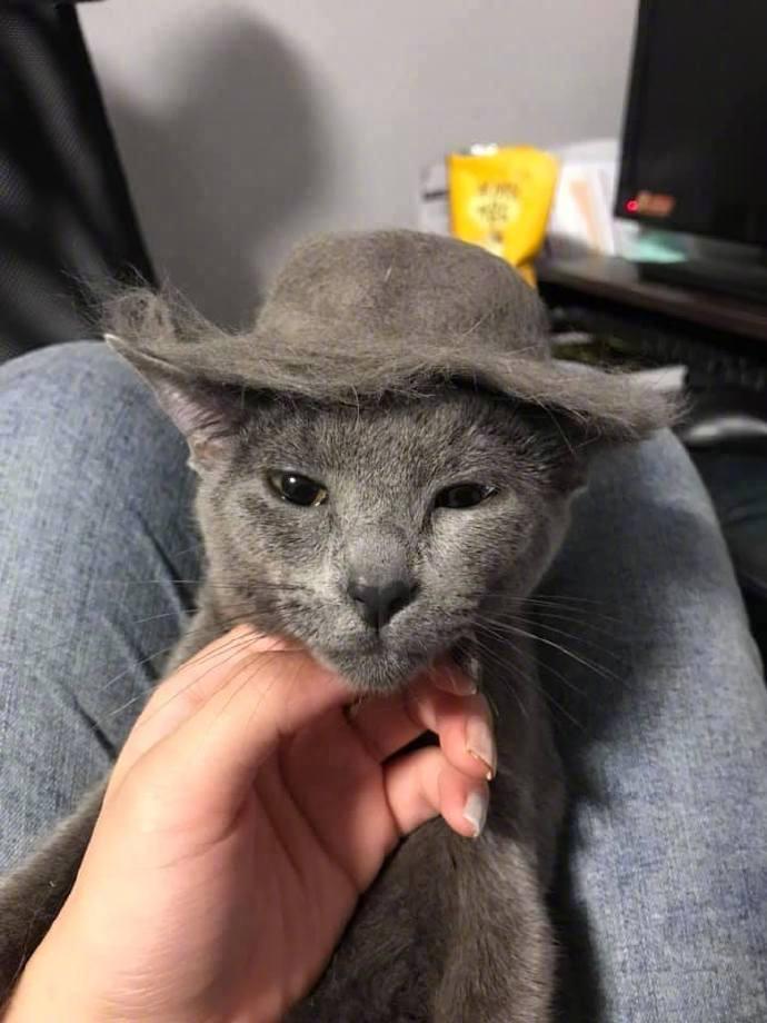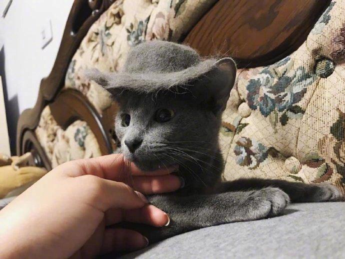 帮猫咪梳毛,结果发现开始掉毛,于是就产生了这顶帽子