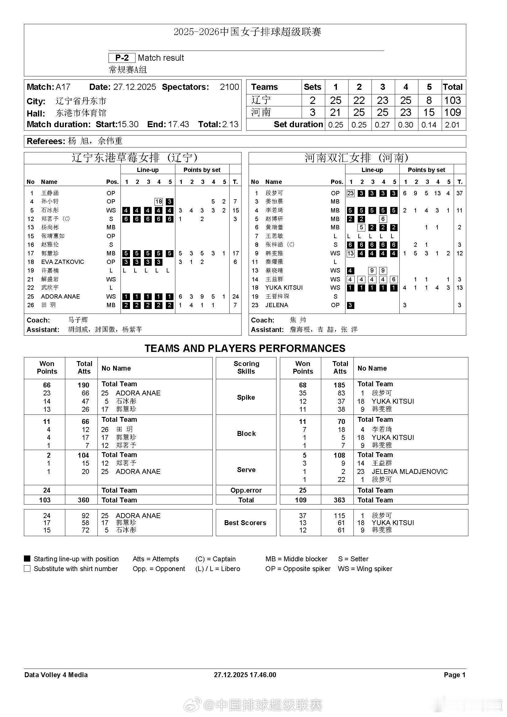 排超联赛2025-2026中国排球超级联赛辽宁东港草莓2-3(25-21/22-25/23-25/25-23/8-15)不敌河南双汇技术统计;我辽半新不旧的外援阿奈贡献24分,全场66扣;段梦可“大腿”干了83扣,贡献37分进攻:66-68;拦网:11-11;发球:2-5;自失:25-24阿奈24分(66扣23中3失误3被拦、1发),郭慧珍17分(26扣13中0失误3被拦、4拦),石冰彤15分(47扣14中4失误4被拦、1拦),田玥7分(4扣3中0失误0被拦、4拦),孙小轩7分(20扣7中1失误0被拦),扎特科维奇6分(23扣5中1失误1被拦、1拦),郑茗予3分(4扣1中0失误0被拦、1拦1发)段梦可37分(83扣35中4失误1被拦、1拦1发),橘井友香13分(37扣12中1失误4被拦、1拦),韩雯雅12分(38扣11中2失误4被拦、1拦),李若琦11分(9扣4中0失误1被拦、7拦),姆拉杰诺维奇3分(6扣2中0失误1被拦、1发),张梓涵3分(2扣2中、1拦),王益群3分(3发),黄瑞蕾2分(5扣2中0失误0被拦)