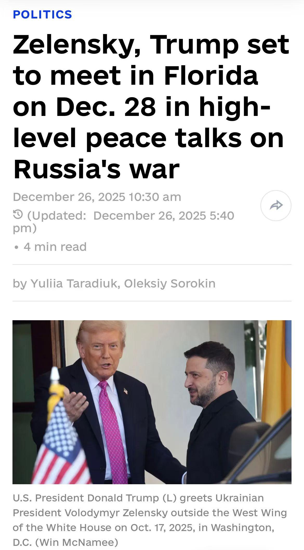 泽连斯基与特朗普将于12月28日在佛罗里达州就乌克兰和平举行峰会。此前,乌克兰和平协议的20点计划中的90%已经达成一致。此次泽连斯基与特朗普将就顿涅斯克领土问题、扎波罗热核电站问题举行会谈。在前往美国之前,泽连斯基表示,他希望与特朗普就和平框架达成一致。泽连斯基称,如果俄罗斯同意60天停火,乌克兰将把可能涉及领土让步的计划提交全民公投。