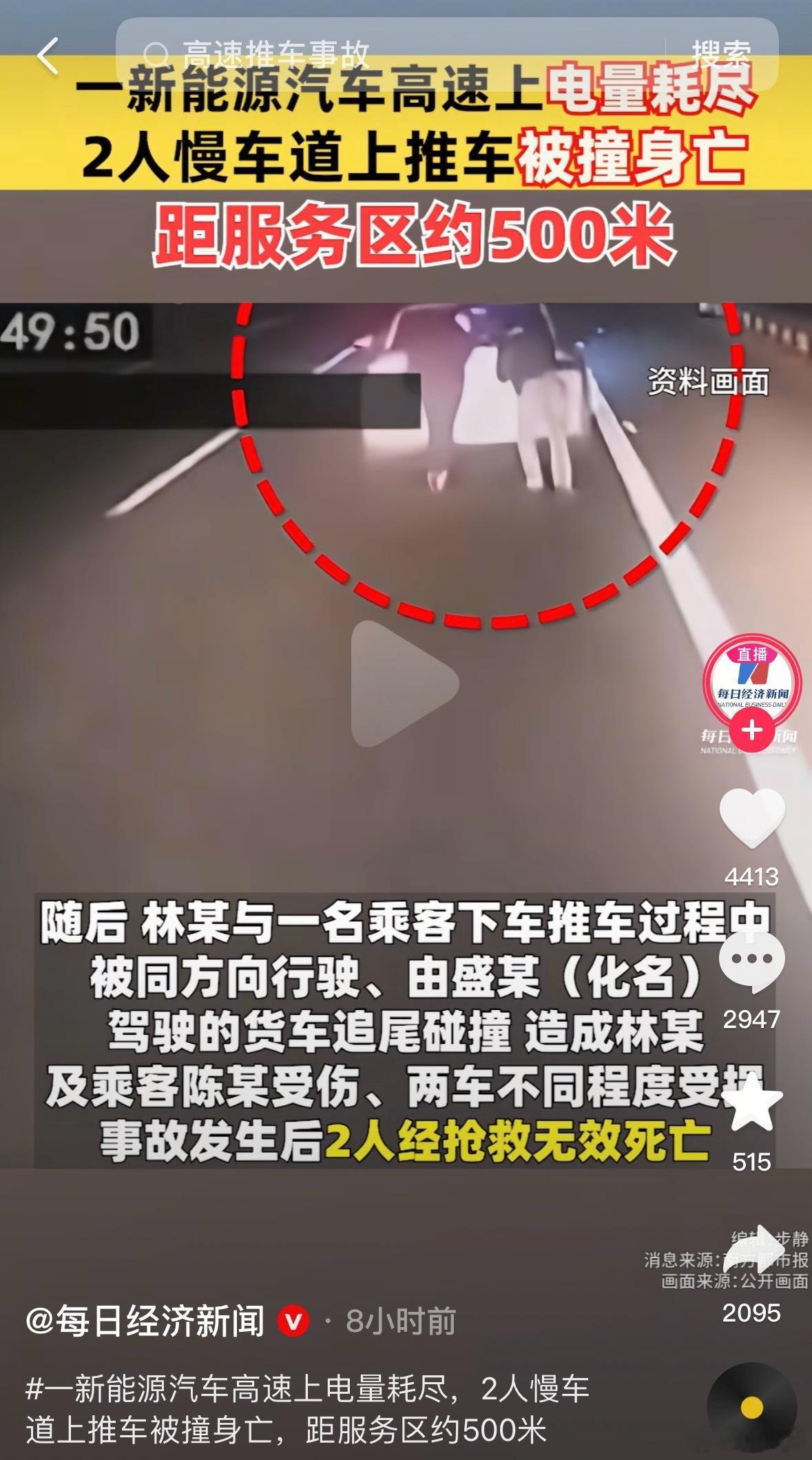新能源车高速没电2人推车被撞身亡我以为再怎么着至少得在应急车道推吧。结果居然是在正常有车行驶的慢车道。。。也别说电车的锅了,就这种司机,你给他台油车他一样能玩出这种操作来