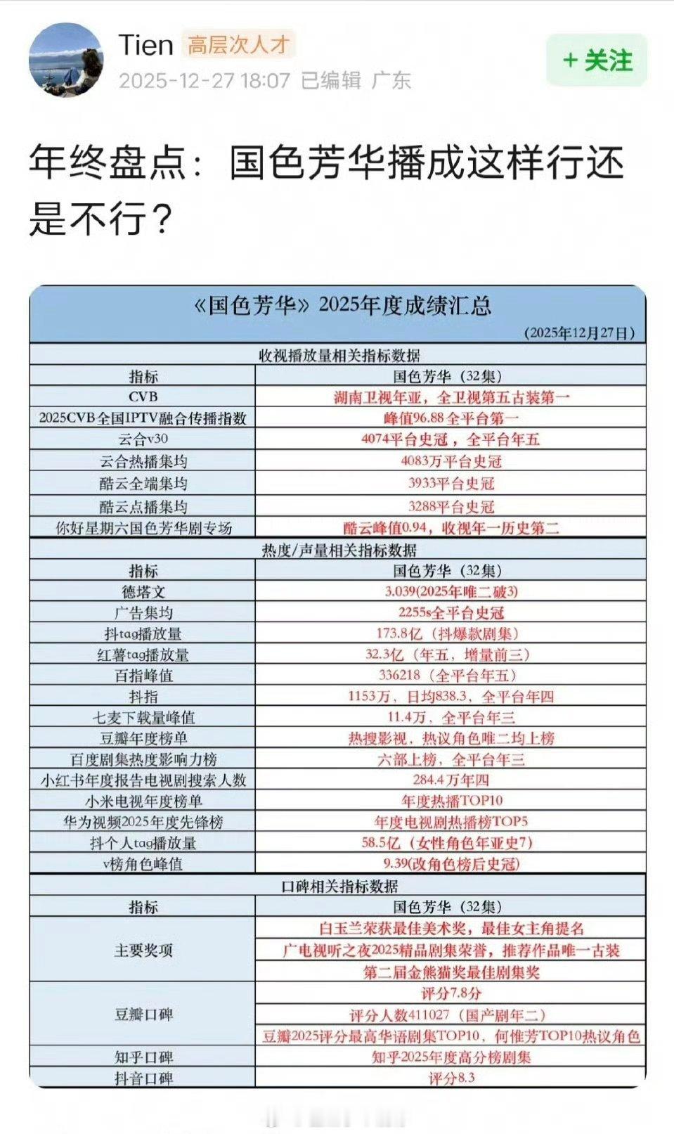 杨紫《国色芳华》2025年度成绩汇总,这个成绩怎么样