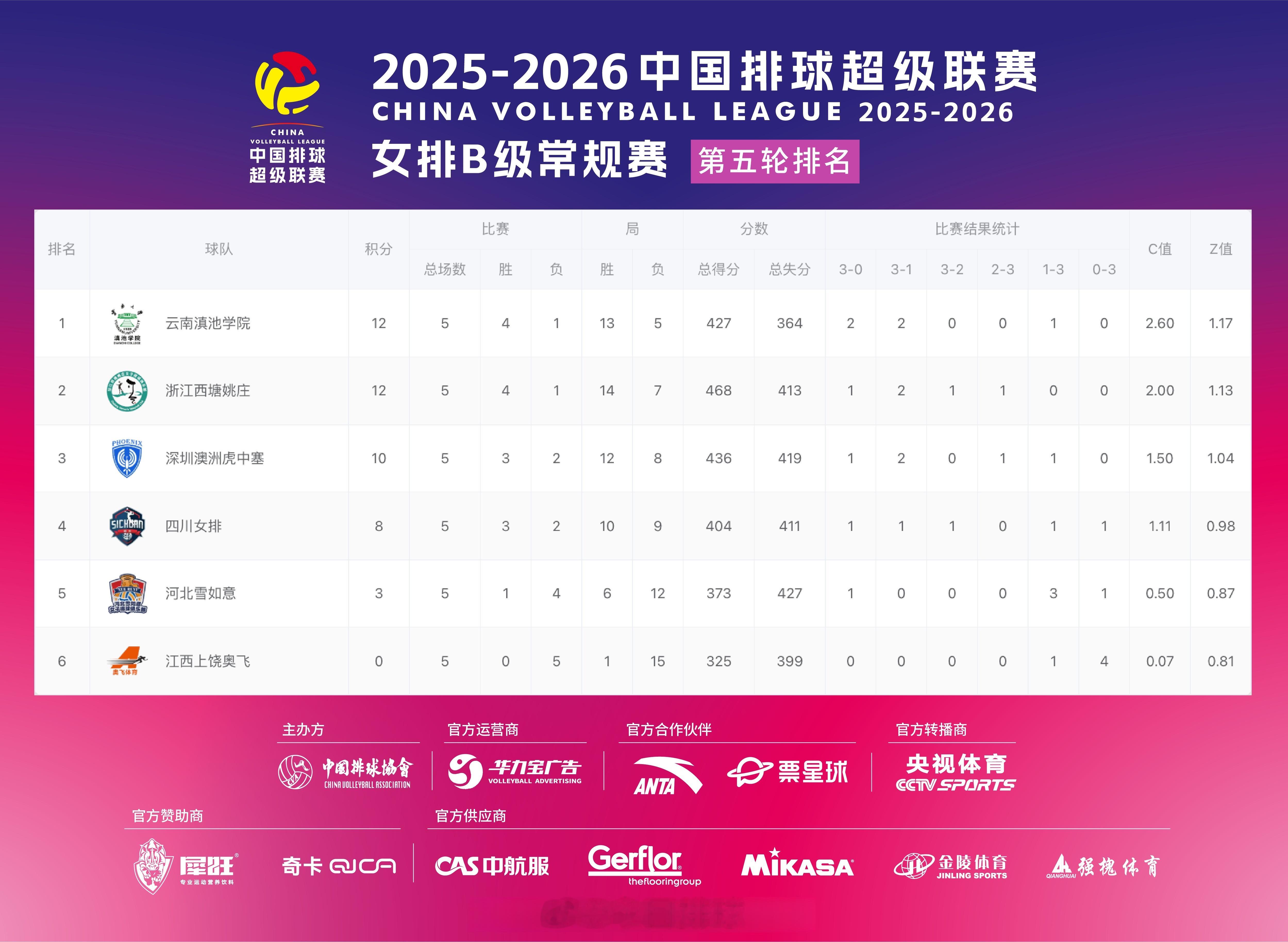 2025-2026中国女排超级联赛 A级和B级常规赛比赛结果,和此轮过后的积分排名,A级山东升至排名第一。
