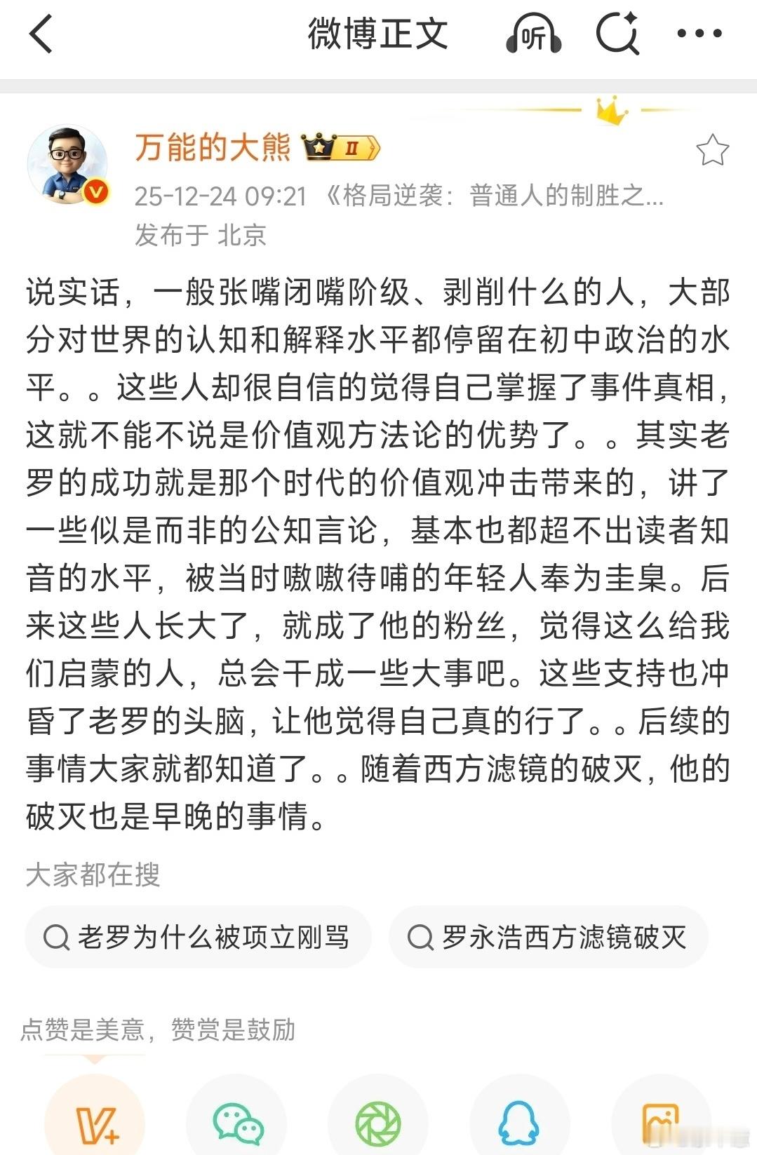 大熊直言:老罗的成功是时代价值观冲击,靠公知言论启蒙年轻人,西方滤镜没了,他的破灭是必然!你怎么看?