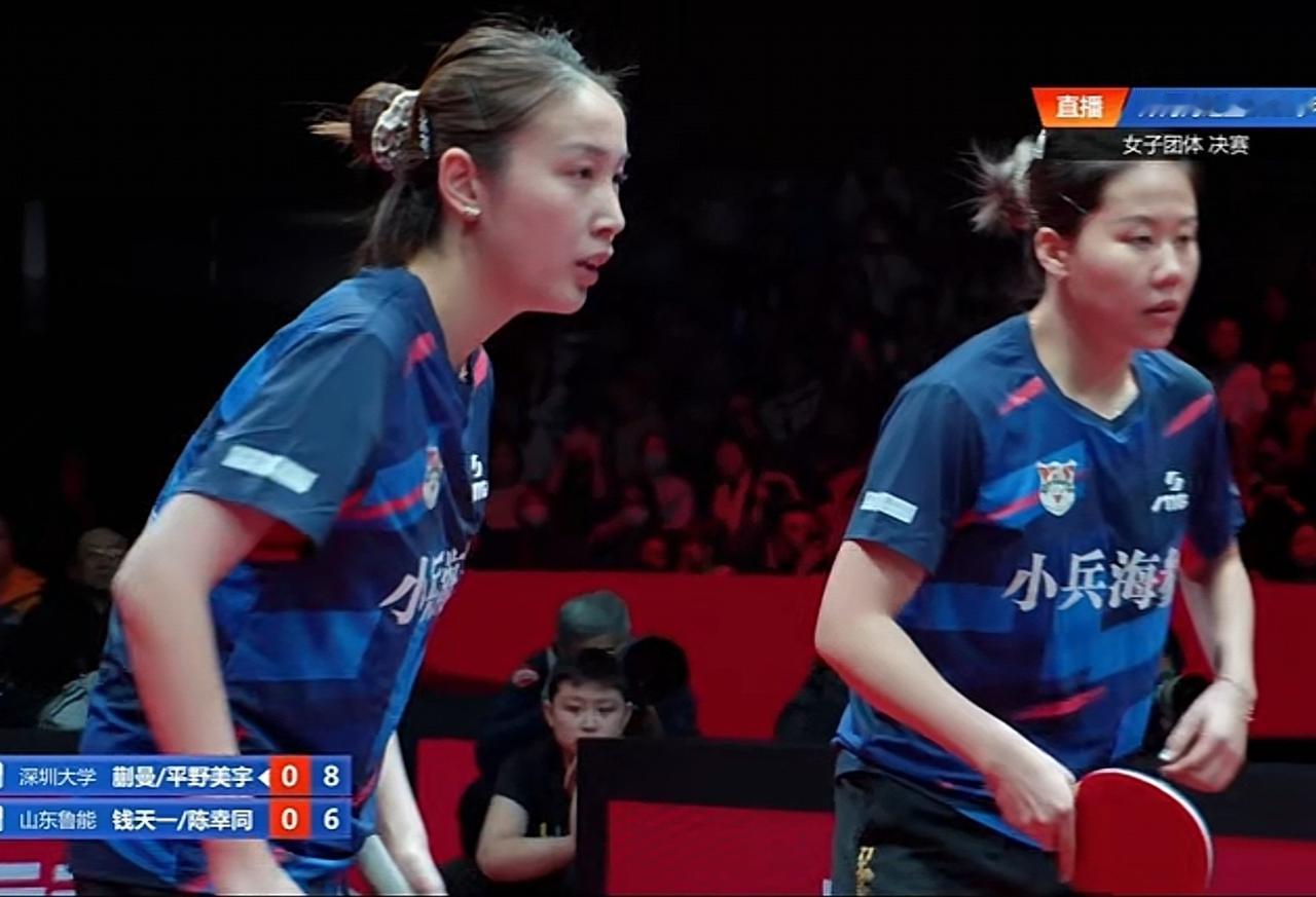 2025乒超女团决赛 深圳大学1-0山东鲁能 第一盘,蒯曼/平野美宇3-0横扫钱天一/陈幸同 首局蒯曼平野配合默契,无谓失误少,衔接也快11-6顺利的拿下。 第二局蒯曼平野继续保持良好状态,7-4再次建立领先优势,11-7钱同组合又丢一局。 第三局 3-0落后的钱同组合暂停调整战术,蒯曼平野越打气势越盛,11-6直落三局拿下比赛。
