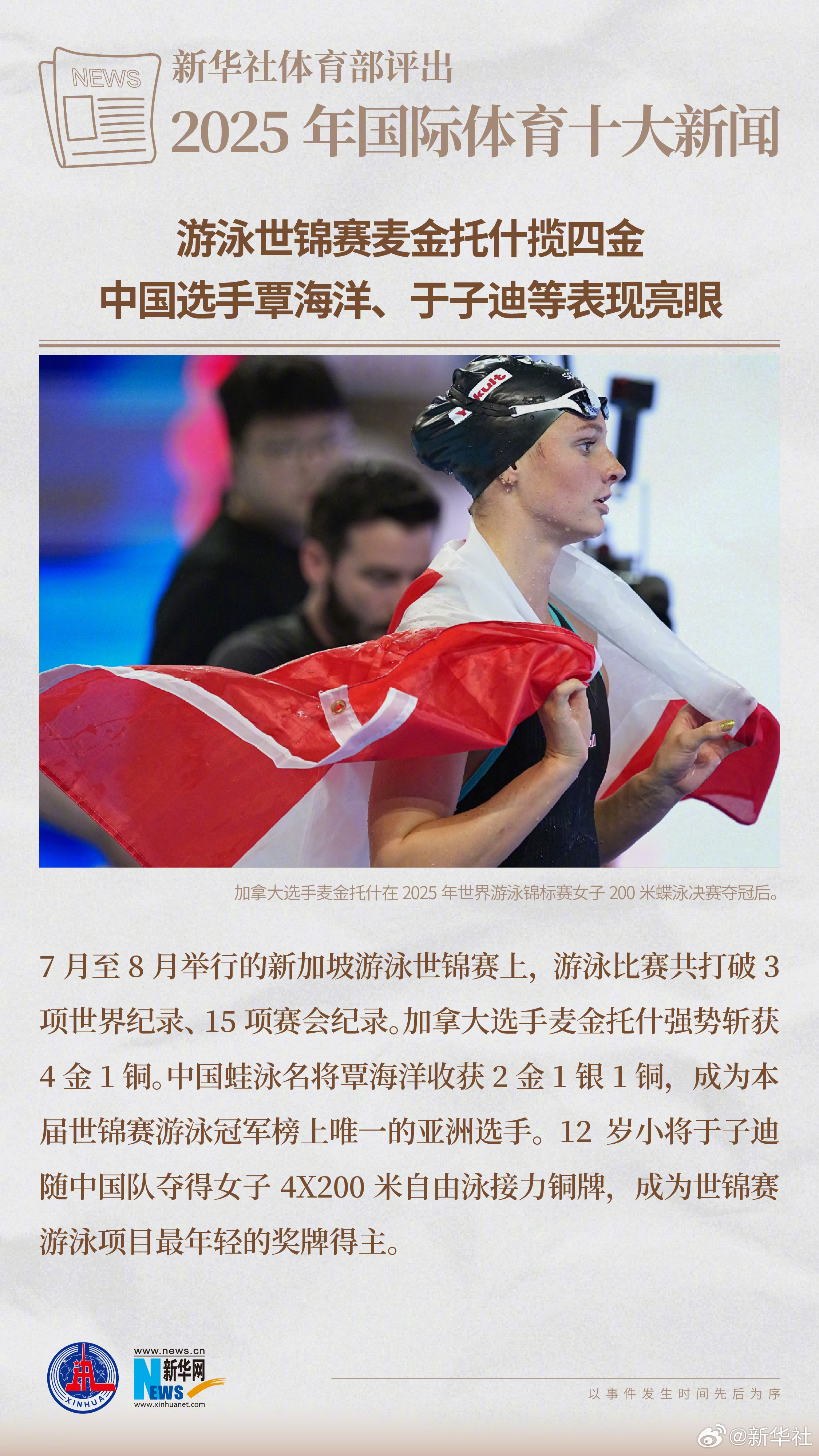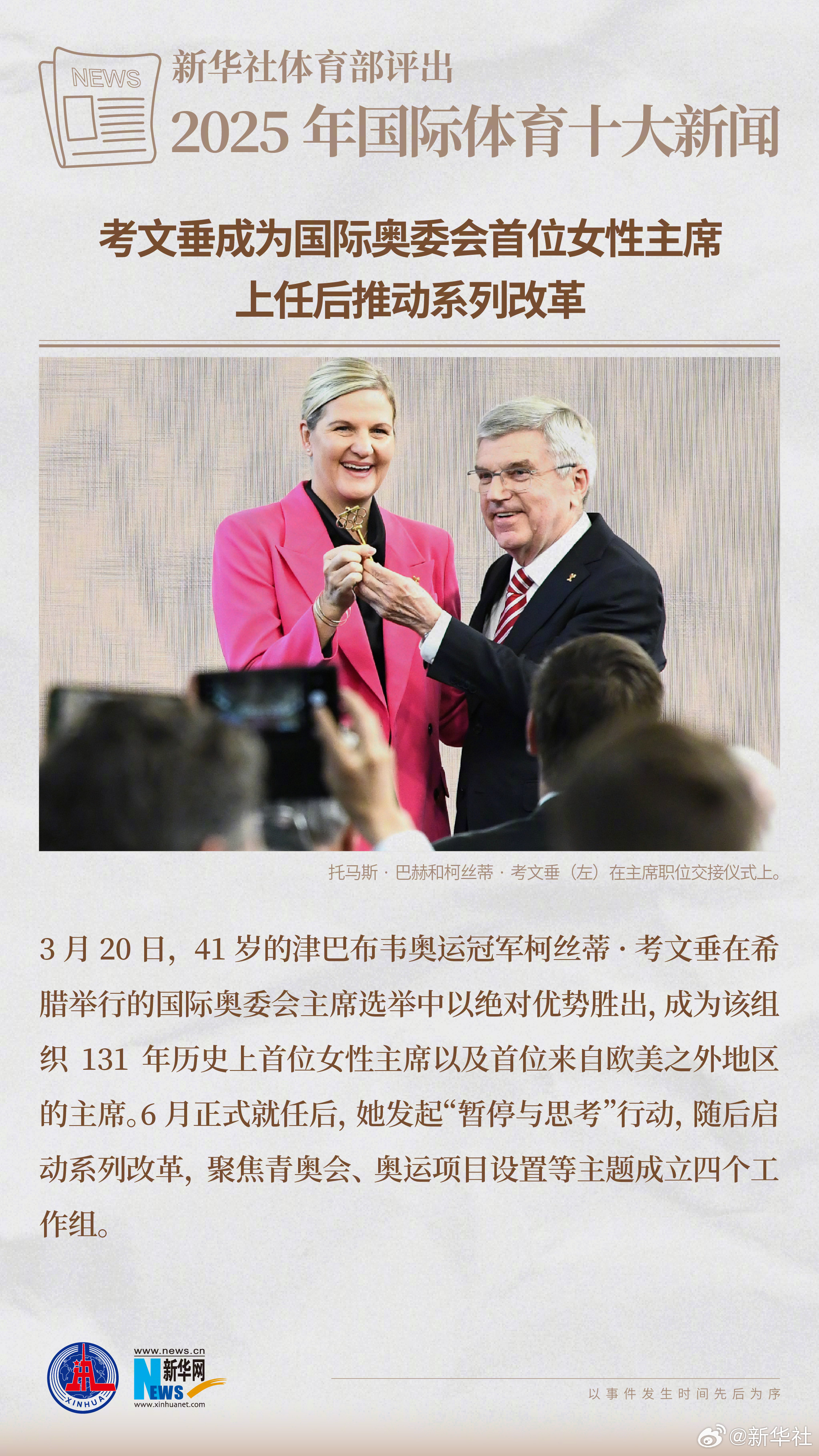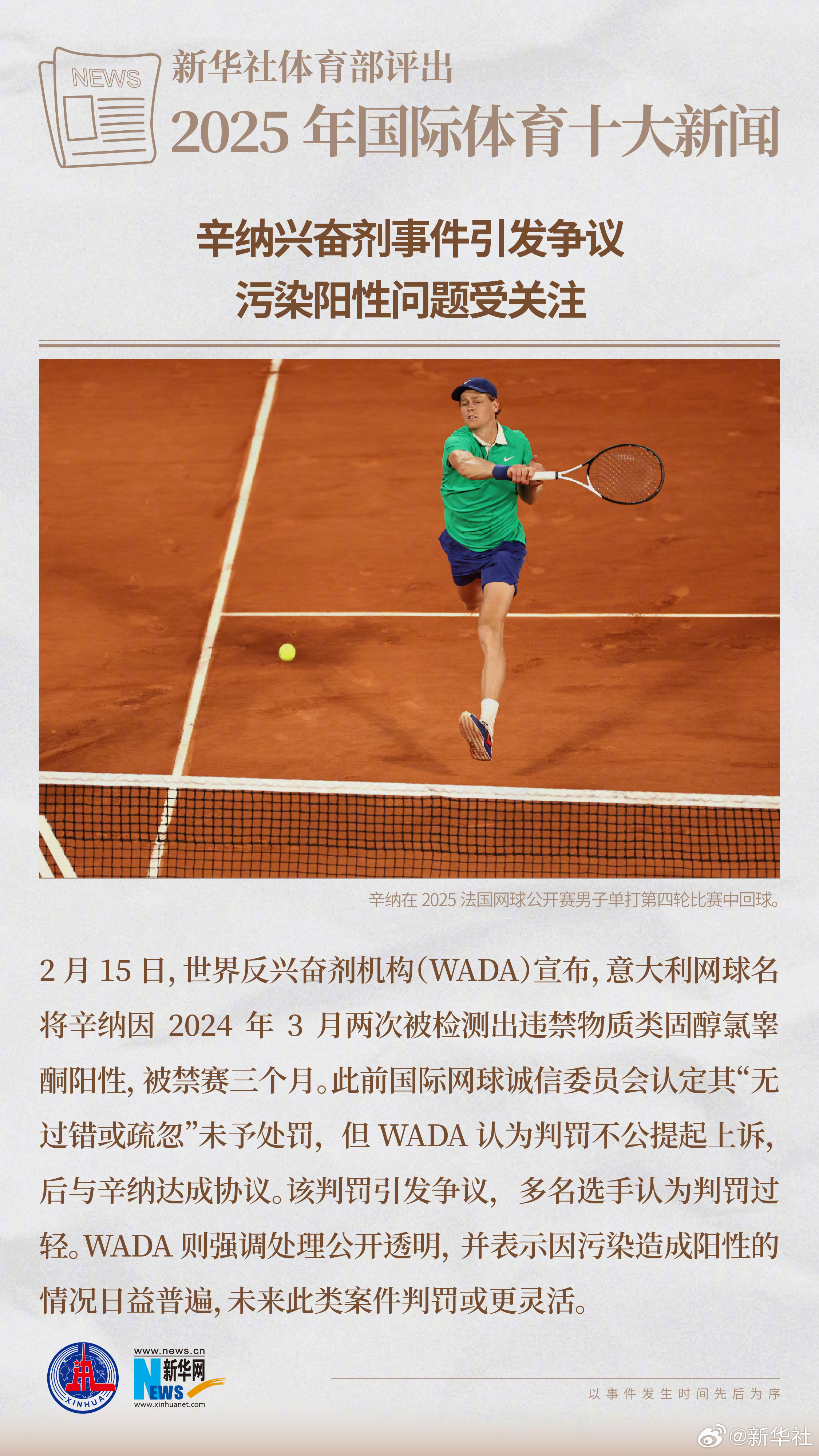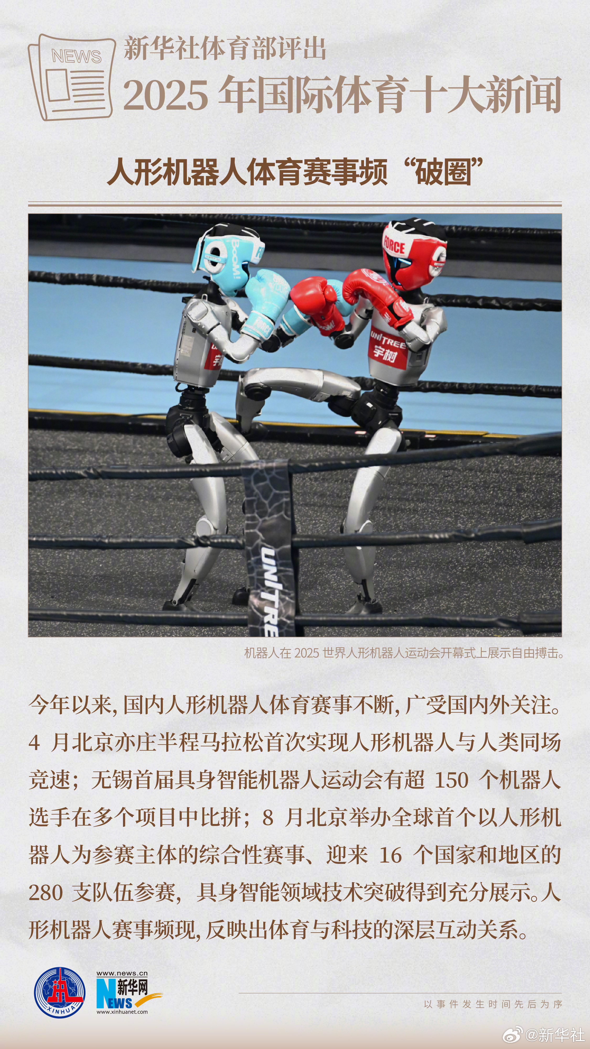 【#2025国际体育十大新闻#】新华社体育部评出2025年国际体育十大新闻(以事件发生时间先后为序) 1、中国成功举办哈尔滨亚冬会和成都世运会 2月7日至14日,第九届亚洲冬季运动会在哈尔滨举办,来自亚洲34个国家和地区的1200余名运动员参赛,规模创历史新高。中国体育代表团获得32金27银26铜共85枚奖牌,雄踞金牌榜和奖牌榜首位。中国台北、泰国等代表团实现亚冬会奖牌“零”的突破。 8月7日至17日,第12届世界运动会在成都举行,来自116个国家和地区的近4000名运动员参赛,棍网球、荷球、桑搏等小众运动彰显非奥项目运动盛会的独特魅力。 2、辛纳兴奋剂事件引发争议 污染阳性问题受关注 2月15日,世界反兴奋剂机构(WADA)宣布,意大利网球名将辛纳因2024年3月两次被检测出违禁物质类固醇氯睾酮阳性,被禁赛三个月。此前国际网球诚信委员会认定其“无过错或疏忽”未予处罚,但WADA认为判罚不公提起上诉,后与辛纳达成协议。该判罚引发争议,多名选手认为判罚过轻。WADA则强调处理公开透明,并表示因污染造成阳性的情况日益普遍,未来此类案件判罚或更灵活。 3、考文垂成为国际奥委会首位女性主席 上任后推动系列改革 3月20日,41岁的津巴布韦奥运冠军柯丝蒂·考文垂在希腊举行的国际奥委会主席选举中以绝对优势胜出,成为该组织131年历史上首位女性主席以及首位来自欧美之外地区的主席。6月正式就任后,她发起“暂停与思考”行动,随后启动系列改革,聚焦青奥会、奥运项目设置等主题成立四个工作组。 4、人形机器人体育赛事频“破圈” 今年以来,国内人形机器人体育赛事不断,广受国内外关注。4月北京亦庄半程马拉松首次实现人形机器人与人类同场竞速;无锡首届具身智能机器人运动会有超150个机器人选手在多个项目中比拼;8月北京举办全球首个以人形机器人为参赛主体的综合性赛事、迎来16个国家和地区的280支队伍参赛,具身智能领域技术突破得到充分展示。人形机器人赛事频现,反映出体育与科技的深层互动关系。 5、首届新版世俱杯切尔西夺冠 世界杯扩军后迎来多支新军 6月14日至7月13日,扩军至32支球队的首届新版国际足联俱乐部世界杯在美国举办。决赛中,英超切尔西队3:0击败法甲巴黎圣日耳曼队,队史第二次夺得世俱杯冠军。首次扩军至48支球队的2026美加墨世界杯于12月5日完成分组抽签,佛得角、库拉索、乌兹别克斯坦、约旦等队首次入围决赛圈。 6、全球体育界关注女性竞赛公平 多个国际体育组织引入基因检测 考文垂6月就任主席后,国际奥委会围绕跨性别参赛等女性赛事公平问题展开广泛讨论,随后成立专家与单项联合会联合工作组,重新审视女性项目参赛资格。世界拳击联合会、世界田径联合会等国际体育组织在年内先后引入基因检测确认运动员生物性别,多维度保障女性赛事公正透明。 7、游泳世锦赛麦金托什揽四金 中国选手覃海洋、于子迪等表现亮眼 7月至8月举行的新加坡游泳世锦赛上,游泳比赛共打破3项世界纪录、15项赛会纪录。加拿大选手麦金托什强势斩获4金1铜。中国蛙泳名将覃海洋收获2金1银1铜,成为本届世锦赛游泳冠军榜上唯一的亚洲选手。12岁小将于子迪随中国队夺得女子4X200米自由泳接力铜牌,成为世锦赛游泳项目最年轻的奖牌得主。 8、男子撑杆跳高进入“6米30”时代 田径世锦赛将重返中国举办 9月13日至21日的东京田径世锦赛上,瑞典名将杜普兰蒂斯跳过6米30,职业生涯第14次改写男子撑杆跳高世界纪录。本届赛事共诞生9项世锦赛纪录,其中美国名将麦克劳林打破了尘封42年的女子400米世锦赛纪录。两年一度的田径世锦赛已经进入“北京时间”,将于2027年再度在国家体育场“鸟巢”举办。 9、国际奥委会终止与沙特联合推进电竞奥运会 10月30日,国际奥委会宣布终止与沙特阿拉伯在电竞奥运会项目上的联合推进。首届电竞奥运会原定于2025年举行。但在今年2月,国际奥委会宣布将其推迟至2027年举办。国际奥委会表示,需进一步明确电竞奥运会的定位、实施方式及对各国家和地区奥委会的影响。 10、诺里斯首夺F1总冠军 相关电影创票房纪录 12月7日,迈凯伦车手诺里斯在2025赛季世界一级方程式赛车锦标赛(F1)收官站阿布扎比大奖赛上获第三名,从而首次加冕车手总冠军,打破红牛车手维斯塔潘连续四个赛季的垄断。维斯塔潘则在意大利大奖赛排位赛中创下1分18秒792(时速264.682公里)的F1历史最快圈速。赛事之外,电影《F1:狂飙飞车》全球票房突破6亿美元,登顶体育电影历史票房榜。