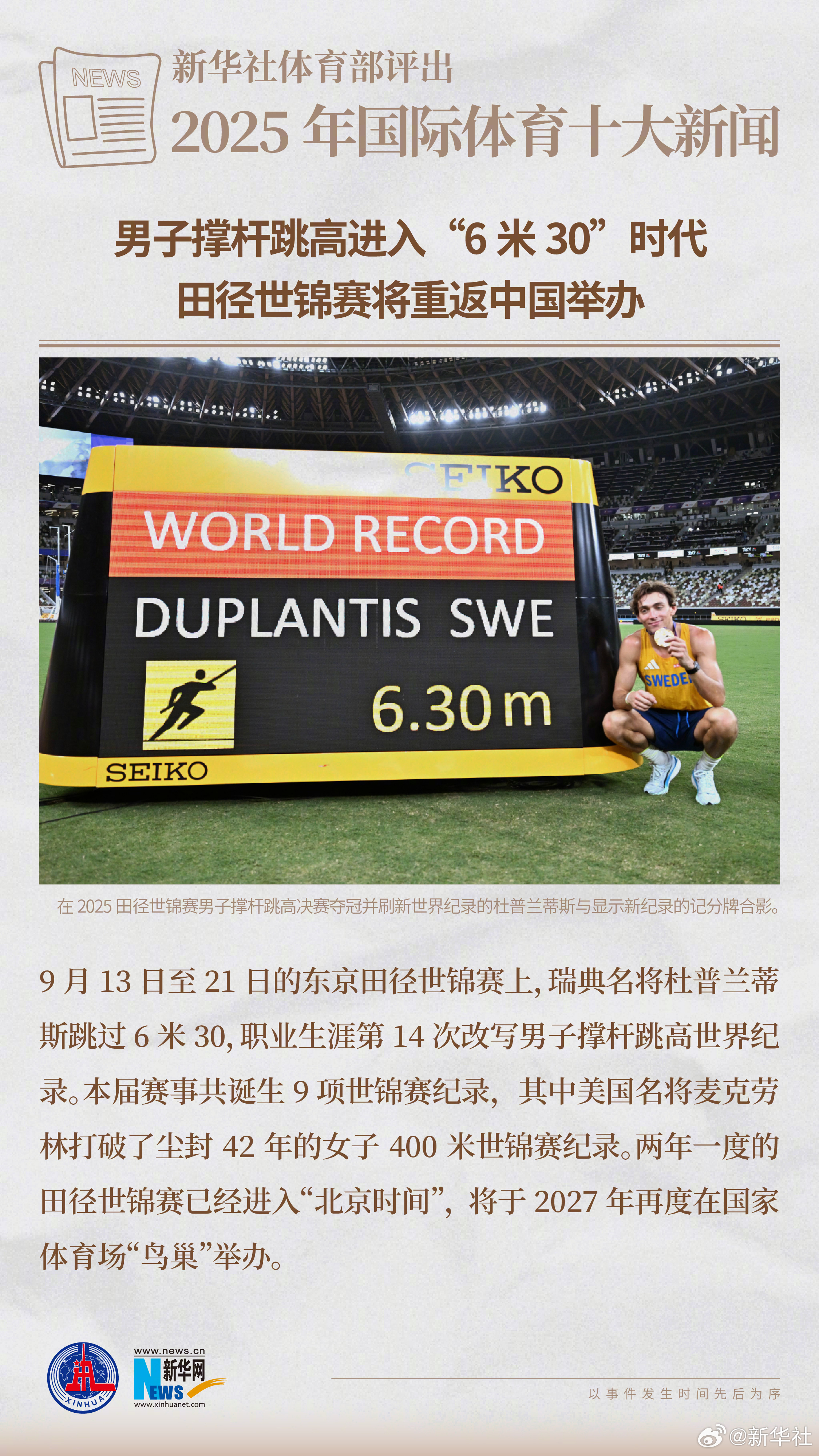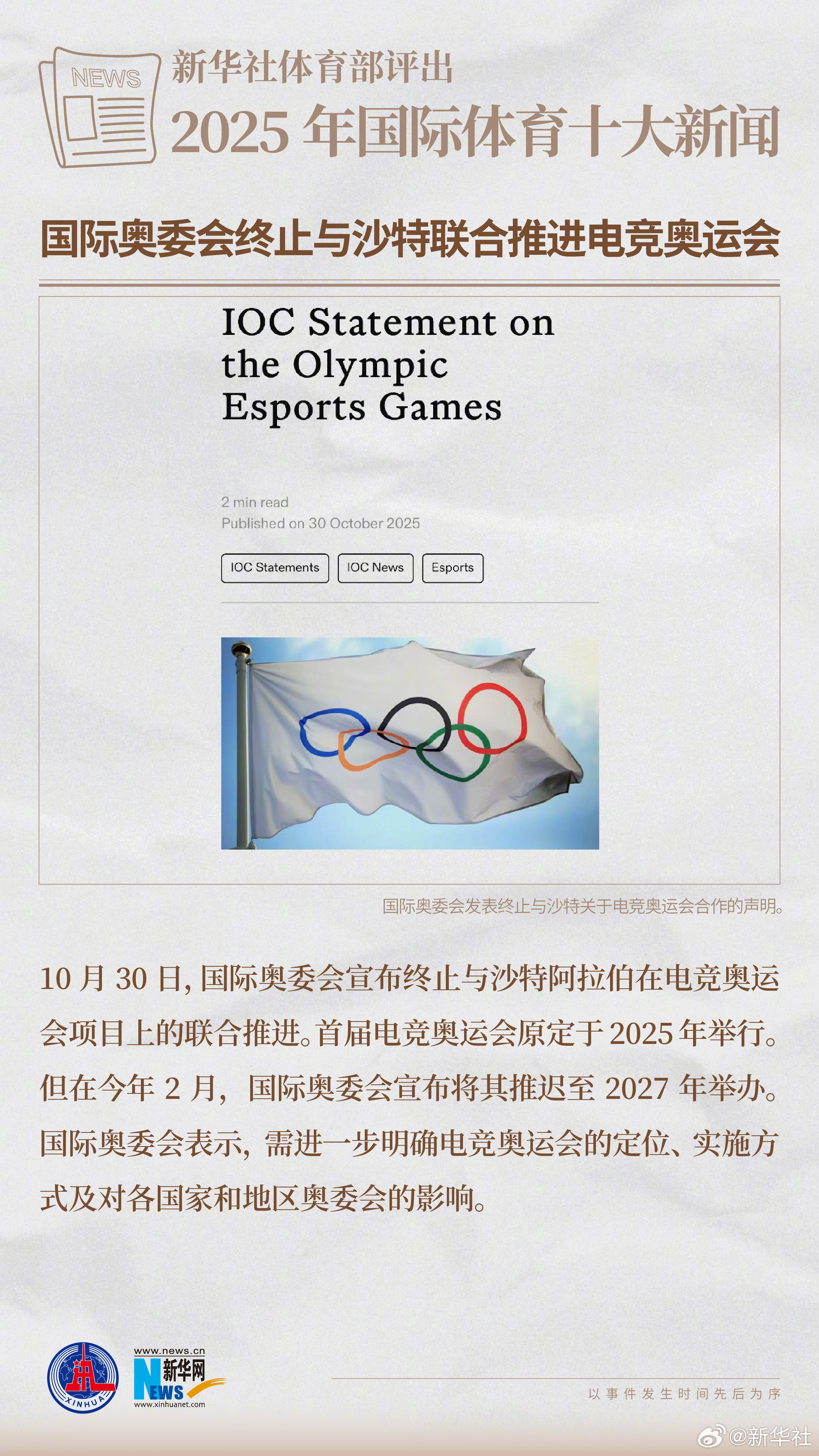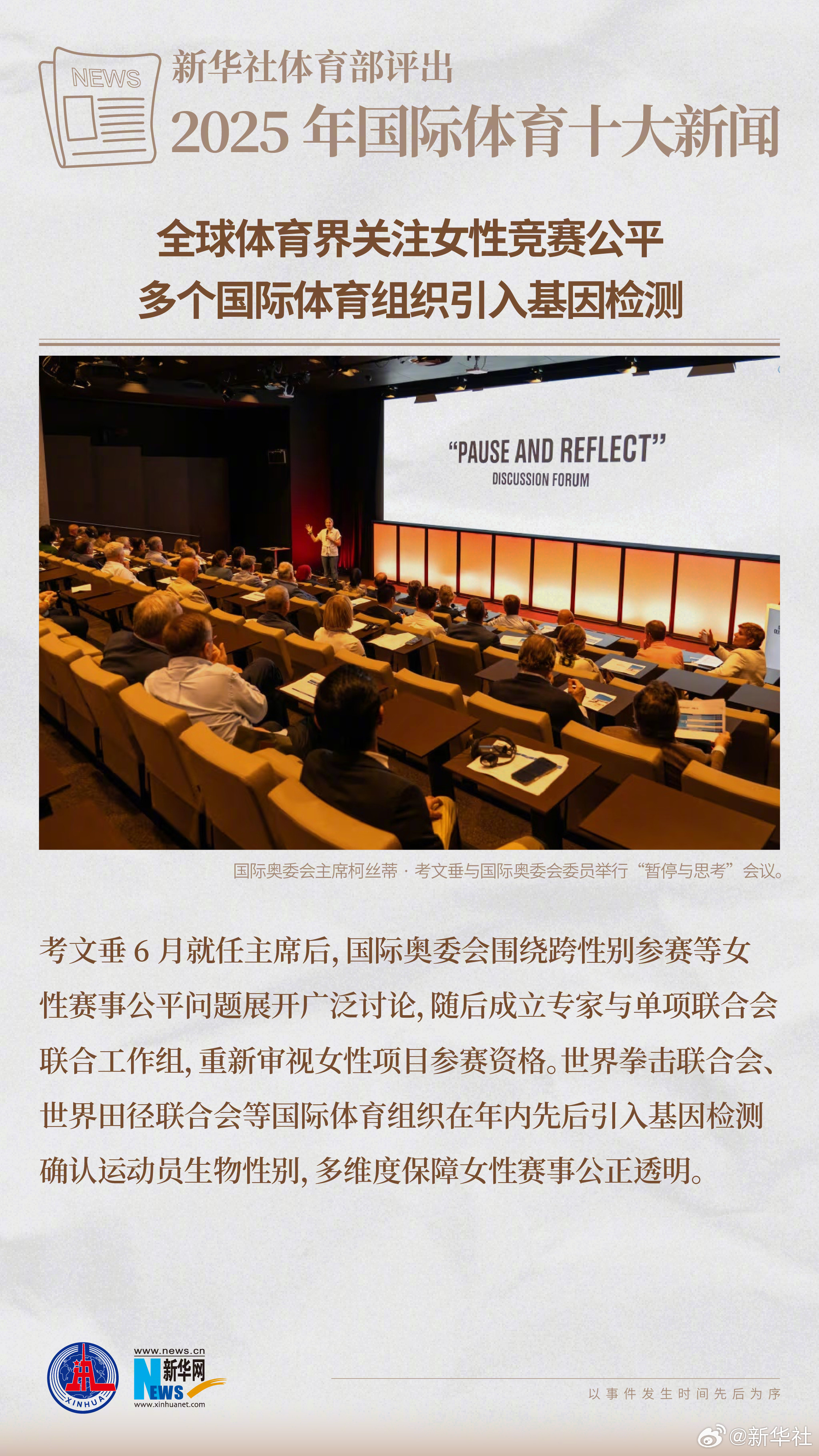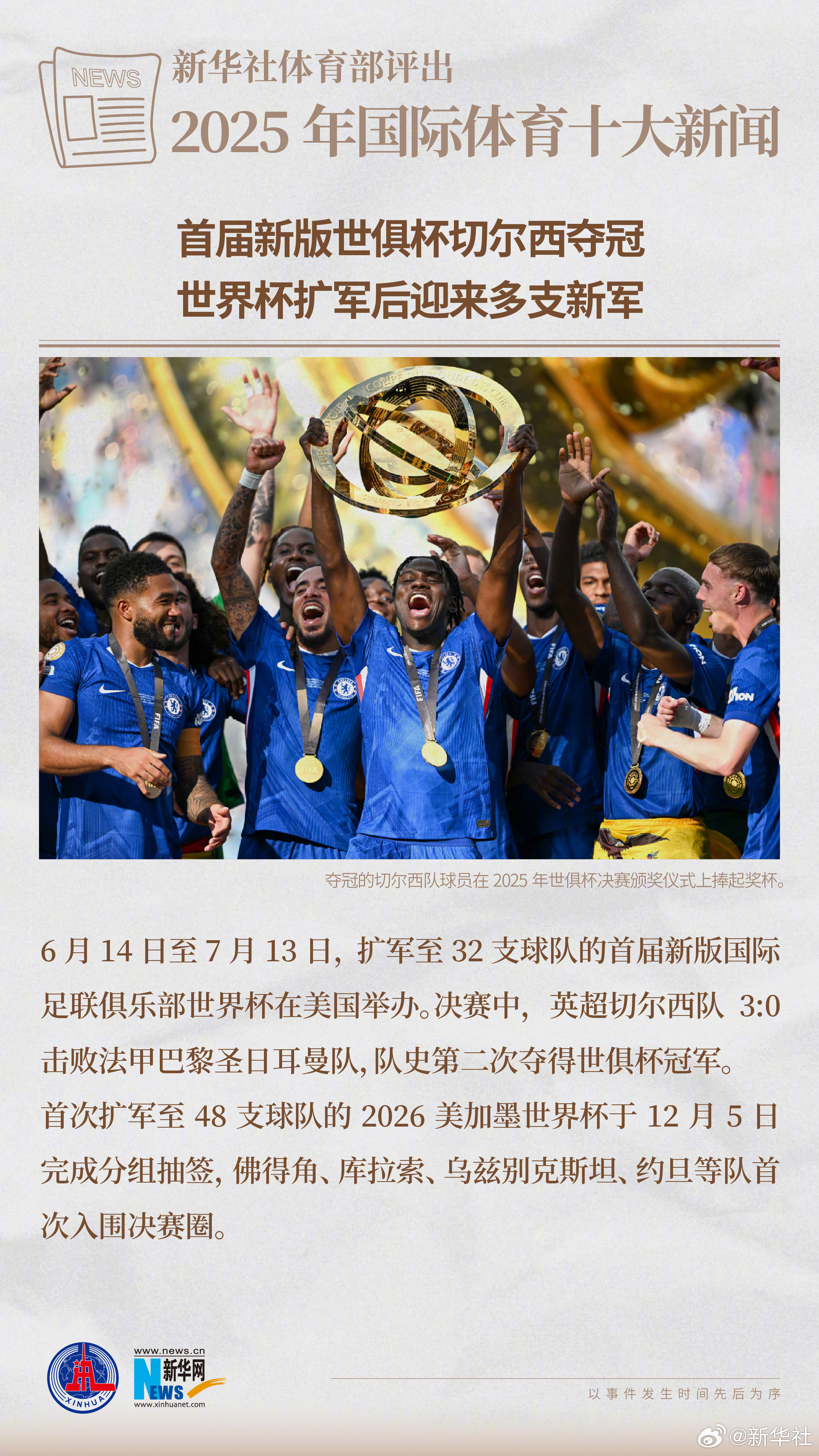 【#2025国际体育十大新闻#】新华社体育部评出2025年国际体育十大新闻(以事件发生时间先后为序) 1、中国成功举办哈尔滨亚冬会和成都世运会 2月7日至14日,第九届亚洲冬季运动会在哈尔滨举办,来自亚洲34个国家和地区的1200余名运动员参赛,规模创历史新高。中国体育代表团获得32金27银26铜共85枚奖牌,雄踞金牌榜和奖牌榜首位。中国台北、泰国等代表团实现亚冬会奖牌“零”的突破。 8月7日至17日,第12届世界运动会在成都举行,来自116个国家和地区的近4000名运动员参赛,棍网球、荷球、桑搏等小众运动彰显非奥项目运动盛会的独特魅力。 2、辛纳兴奋剂事件引发争议 污染阳性问题受关注 2月15日,世界反兴奋剂机构(WADA)宣布,意大利网球名将辛纳因2024年3月两次被检测出违禁物质类固醇氯睾酮阳性,被禁赛三个月。此前国际网球诚信委员会认定其“无过错或疏忽”未予处罚,但WADA认为判罚不公提起上诉,后与辛纳达成协议。该判罚引发争议,多名选手认为判罚过轻。WADA则强调处理公开透明,并表示因污染造成阳性的情况日益普遍,未来此类案件判罚或更灵活。 3、考文垂成为国际奥委会首位女性主席 上任后推动系列改革 3月20日,41岁的津巴布韦奥运冠军柯丝蒂·考文垂在希腊举行的国际奥委会主席选举中以绝对优势胜出,成为该组织131年历史上首位女性主席以及首位来自欧美之外地区的主席。6月正式就任后,她发起“暂停与思考”行动,随后启动系列改革,聚焦青奥会、奥运项目设置等主题成立四个工作组。 4、人形机器人体育赛事频“破圈” 今年以来,国内人形机器人体育赛事不断,广受国内外关注。4月北京亦庄半程马拉松首次实现人形机器人与人类同场竞速;无锡首届具身智能机器人运动会有超150个机器人选手在多个项目中比拼;8月北京举办全球首个以人形机器人为参赛主体的综合性赛事、迎来16个国家和地区的280支队伍参赛,具身智能领域技术突破得到充分展示。人形机器人赛事频现,反映出体育与科技的深层互动关系。 5、首届新版世俱杯切尔西夺冠 世界杯扩军后迎来多支新军 6月14日至7月13日,扩军至32支球队的首届新版国际足联俱乐部世界杯在美国举办。决赛中,英超切尔西队3:0击败法甲巴黎圣日耳曼队,队史第二次夺得世俱杯冠军。首次扩军至48支球队的2026美加墨世界杯于12月5日完成分组抽签,佛得角、库拉索、乌兹别克斯坦、约旦等队首次入围决赛圈。 6、全球体育界关注女性竞赛公平 多个国际体育组织引入基因检测 考文垂6月就任主席后,国际奥委会围绕跨性别参赛等女性赛事公平问题展开广泛讨论,随后成立专家与单项联合会联合工作组,重新审视女性项目参赛资格。世界拳击联合会、世界田径联合会等国际体育组织在年内先后引入基因检测确认运动员生物性别,多维度保障女性赛事公正透明。 7、游泳世锦赛麦金托什揽四金 中国选手覃海洋、于子迪等表现亮眼 7月至8月举行的新加坡游泳世锦赛上,游泳比赛共打破3项世界纪录、15项赛会纪录。加拿大选手麦金托什强势斩获4金1铜。中国蛙泳名将覃海洋收获2金1银1铜,成为本届世锦赛游泳冠军榜上唯一的亚洲选手。12岁小将于子迪随中国队夺得女子4X200米自由泳接力铜牌,成为世锦赛游泳项目最年轻的奖牌得主。 8、男子撑杆跳高进入“6米30”时代 田径世锦赛将重返中国举办 9月13日至21日的东京田径世锦赛上,瑞典名将杜普兰蒂斯跳过6米30,职业生涯第14次改写男子撑杆跳高世界纪录。本届赛事共诞生9项世锦赛纪录,其中美国名将麦克劳林打破了尘封42年的女子400米世锦赛纪录。两年一度的田径世锦赛已经进入“北京时间”,将于2027年再度在国家体育场“鸟巢”举办。 9、国际奥委会终止与沙特联合推进电竞奥运会 10月30日,国际奥委会宣布终止与沙特阿拉伯在电竞奥运会项目上的联合推进。首届电竞奥运会原定于2025年举行。但在今年2月,国际奥委会宣布将其推迟至2027年举办。国际奥委会表示,需进一步明确电竞奥运会的定位、实施方式及对各国家和地区奥委会的影响。 10、诺里斯首夺F1总冠军 相关电影创票房纪录 12月7日,迈凯伦车手诺里斯在2025赛季世界一级方程式赛车锦标赛(F1)收官站阿布扎比大奖赛上获第三名,从而首次加冕车手总冠军,打破红牛车手维斯塔潘连续四个赛季的垄断。维斯塔潘则在意大利大奖赛排位赛中创下1分18秒792(时速264.682公里)的F1历史最快圈速。赛事之外,电影《F1:狂飙飞车》全球票房突破6亿美元,登顶体育电影历史票房榜。