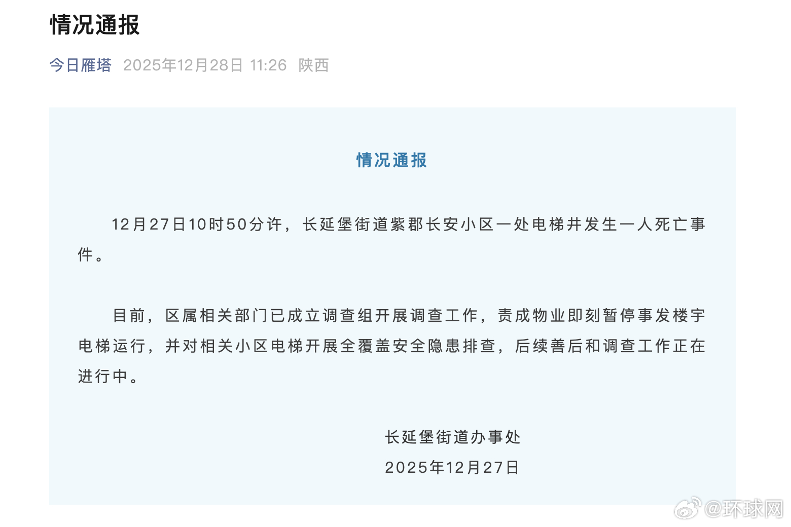 #西安通报一小区电梯故障致一人死亡#【西安雁塔通报一小区电梯井发生一人死亡事件:已成立调查组开展调查工作】↓↓