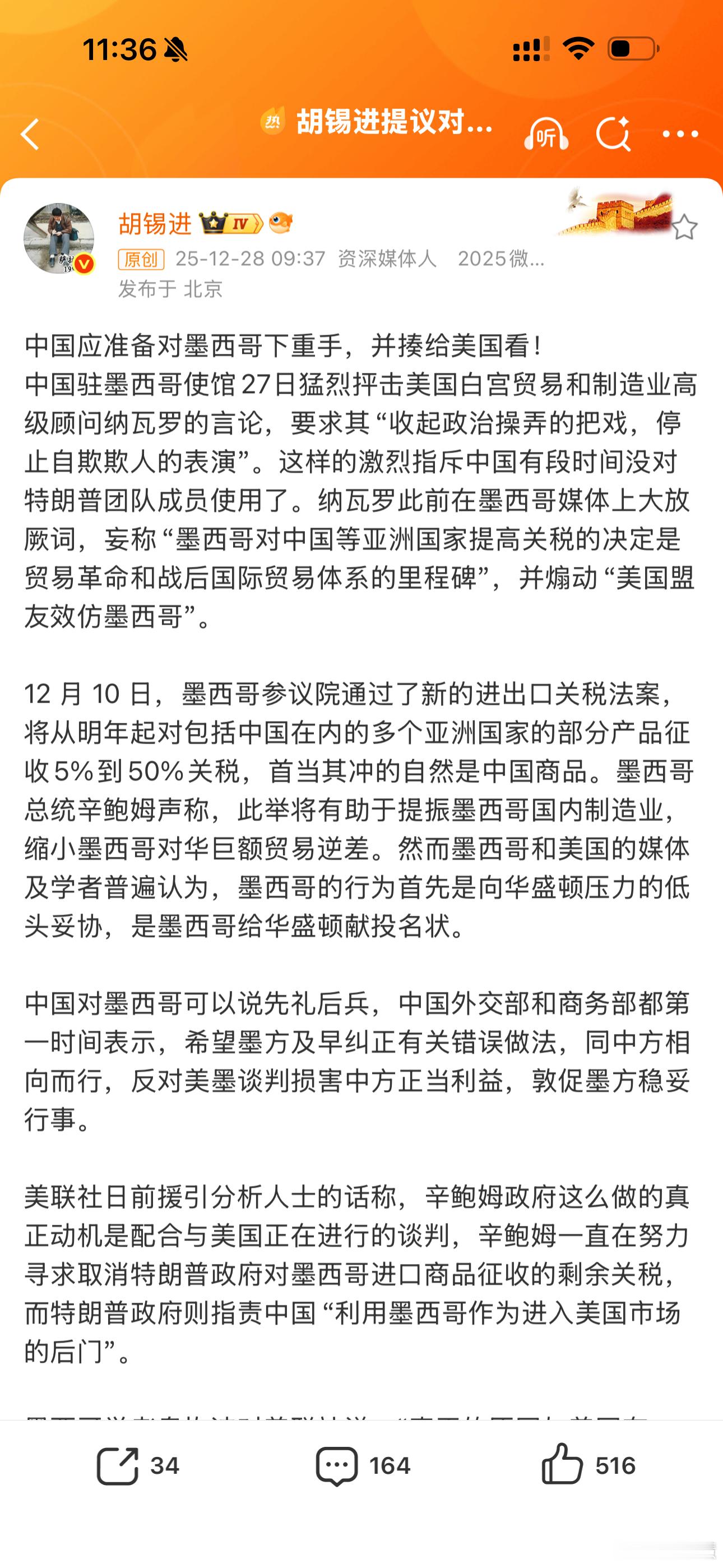 墨西哥对华加税!美国曲线围堵,胡锡进提议对墨西哥下重手!墨西哥跟风美国,对华加征5%-50%关税!表面是提振本土产业,实则是向美献投名状,为换取美关税豁免,不惜损害中墨贸易。中国早已先礼后兵,从劝诫到调查,立场坚定。美妄图借盟友之手,削弱中国外贸,搞"曲线作战",算盘打得太精!中国外贸韧性十足,供应链无可替代。若墨方执迷不悟,中方必将重拳反制!既打给墨西哥看,也警告美国:四处点火,终将引火烧身!
