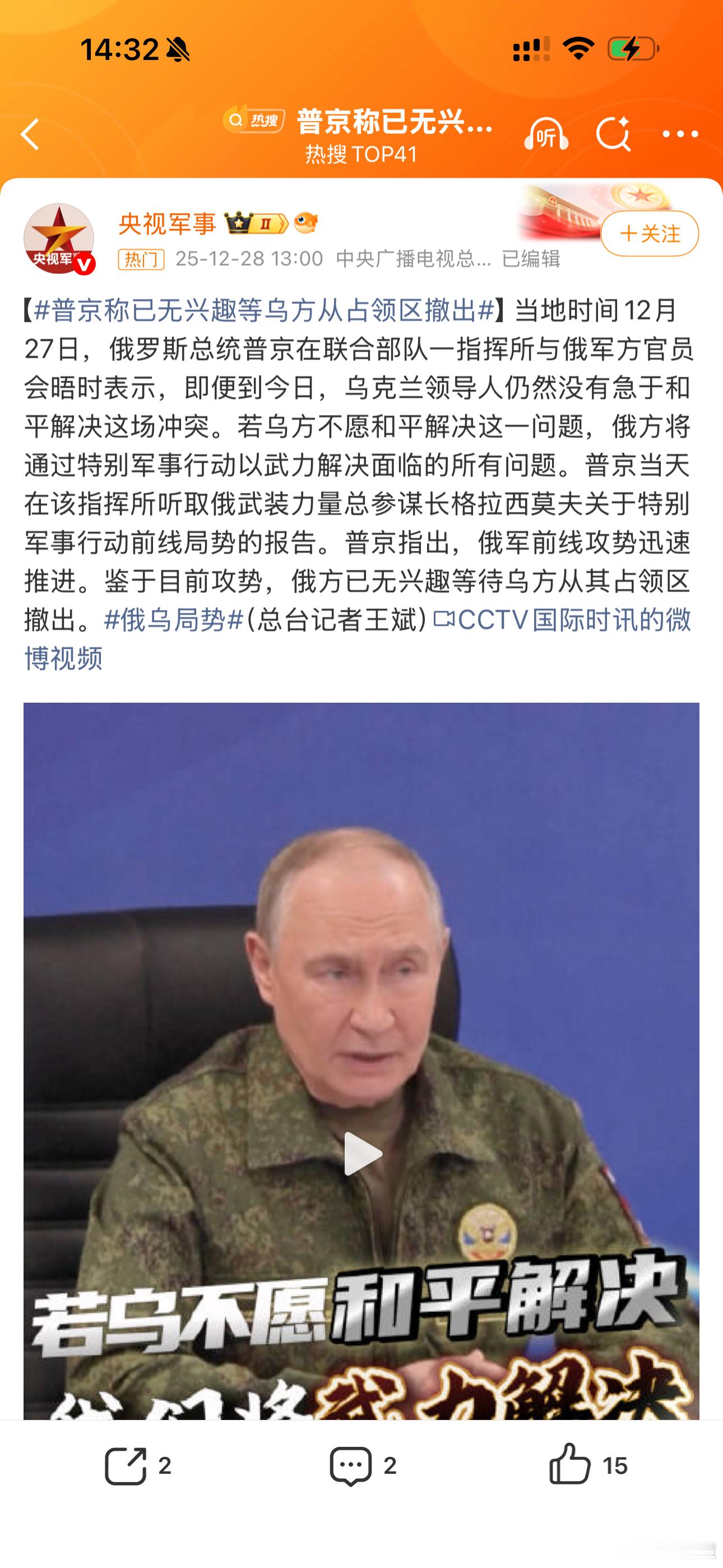 俄乌局势突变!普京发出强硬表态当地时间12月27日,普京视察俄军指挥所。俄军前线攻势迅猛,已控多座乌方城市。普京直言,乌方无意和平解决冲突。俄方已无兴趣等待乌方撤离,若乌方拒绝和谈,俄将用武力解决所有问题!普京称已无兴趣等乌方从占领区撤出:究竟谁应该撤军?