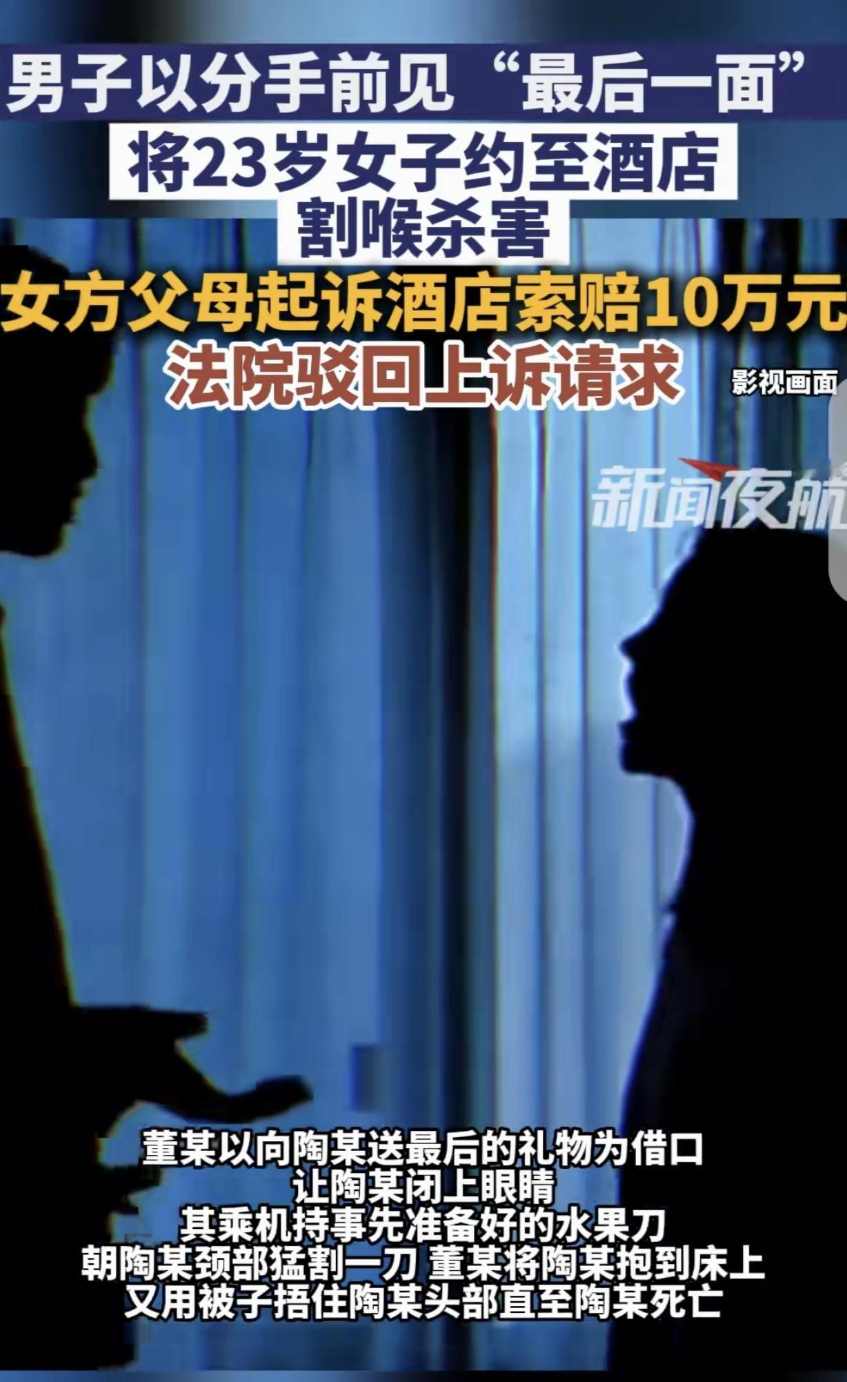 “这就是看错男人的代价!”山东聊城,一23岁女子跟男友分手,男友提出分手前见“最后一面”把女子约到酒店,他让女子闭眼睛,说有礼物相送,可女子这一闭,眼睛再也没睁开,她被男友割喉杀害,女子的父母直接把酒店告上法庭,索赔10万元,案子经过2审,法院的判决让人始料不及。 女子陶某和董某谈恋爱,可经过相处,董某身上的缺点不断暴露出来,让陶某难以接受。 陶某要找白首不相离的那个人,不是小孩子过家家,这还没结婚呢,董某就浑身毛病,婚后的日子怎么过下去? 所以,陶某当机立断,决定快刀斩乱麻,跟董某分手。 可董某心有不甘,爱而不得却萌生恨意,既然你不属于我,那我就毁掉你。 于是,董某就跟陶某提出,分手可以,但他对陶某的感情欲罢不能,希望分手前能见最后一面,然后两个人就各奔东西,互不打扰。 陶某毕竟是个重感情的女子,听到董某这么深情款款的说辞,她也不好意思拒绝了,就草率的答应了。 陶某做梦都没想到,董某这么偏激,阴险,危险正一步步靠近,而她却不自知,竟然欣然赴约。 在某家酒店里,陶某见到了董某,董某不动声色的让陶某闭上眼睛,说有分手礼物要送给她,给她一个惊喜。 陶某五味杂陈的照做,毕竟,眼前的这个男人,虽然不是合适的结婚对象,但他们也走过了一段浓情蜜意,如胶似漆的热恋时光,如今就当给这段感情画上句号了。 可当陶某闭上眼睛,董某却出其不意的掏出一把水果刀,对着陶某的脖子就是一刀,顿时陶某血流如注。 可即使陶某再挣扎反抗也晚了,她压根不是董某的对手,董某把陶某抱到床上,用被子捂住她的脑袋,直到她停止挣扎死亡。 事后,董某被抓捕归案,悲痛欲绝的陶某父母却把酒店告上法庭,在他们看来,酒店只给董某办理了入住登记,却没给陶某登记入住,他们认为酒店失职,没保障女儿的人身安全,存在过错,索赔10万元。 一审驳回了陶某父母的诉讼,他们不服,提起上诉,二审维持原判。 这案子真是让人又痛心又气愤!23岁的姑娘陶某,本该是青春正好、享受爱情的时候,却因为一场错误的恋爱,把命都搭进去了。 更让人唏嘘的是,凶手董某,就因为爱而不得,就起了杀心,这心肠得有多狠毒啊!说到底,还是情感纠纷处理不当,加上董某性格极端,才酿成了这场悲剧。 先说说陶某,她其实挺清醒的。恋爱的时候,发现董某毛病一堆,觉得这不是能过一辈子的人,就果断提分手。 这姑娘有勇气,也拎得清,知道结婚不是儿戏,不能将就。 可她错就错在,太容易心软了。董某一说想见最后一面,她就答应了,还一个人去了酒店。 她可能觉得,毕竟曾经爱过,好聚好散嘛。可她哪知道,董某心里藏着杀机呢!这姑娘太单纯,也太善良了,根本没意识到,有些人,一旦偏激起来,什么事都干得出来。 再说说董某,这简直就是个没人性!爱一个人,得不到就要毁掉,这是什么逻辑?爱情是两个人的事,人家姑娘不愿意了,你还能强求? 他倒好,表面上装深情,说想见最后一面,实际上早就准备好了水果刀,就等着陶某闭眼的时候下手。 这心思,得多阴险啊!更可恶的是,杀了人还不算,还用被子捂住陶某的脑袋,直到她断气。 这种手段,残忍至极,简直不是人干的!董某被抓,那是他罪有应得,可陶某的生命,却再也回不来了。 最让人无语的,是陶某父母把酒店告上法庭这事。他们觉得,酒店没给陶某登记入住,就是失职,没保障女儿的安全。 可法院一审二审都驳回了他们的诉求。为啥?因为酒店的责任,不是无限的。 它确实应该登记入住人员的信息,可这并不能阻止一个蓄谋已久的凶手行凶啊! 董某要是真想杀人,就算酒店登记了陶某,他也能找机会下手。 酒店又不是保安公司,哪能24小时盯着每个客人?陶某父母的悲痛,我们能理解,可把责任全推给酒店,真有点说不过去。 这案子,给我们敲了个警钟。恋爱的时候,一定要擦亮眼睛,看清对方的性格和人品。 遇到极端、偏激的人,赶紧远离,别心软,别抱有侥幸心理。 还有,分手的时候,尽量公开、安全,别一个人去见对方,尤其是对方情绪不稳定的时候。生命只有一次,安全第一啊!希望这样的悲剧,别再发生了。 《民法典》第1198条规定:宾馆、商场等经营场所的经营者,未尽到安全保障义务,造成他人损害的,应当承担侵权责任。 酒店虽未对陶某进行访客登记,违反行政管理规定,但该行为与董某蓄谋杀人无法律上的因果关系。 董某的犯罪行为具有高度隐蔽性以“送礼物”诱骗闭眼行凶,且发生于私密客房内,远超酒店能预见的合理风险范围。 安全保障义务限于“合理限度”,即对可预见、可防范的公共区域风险如消防隐患、设施缺陷,进行管控。客房经入住即形成私密空间,酒店无法也无权监控室内行为。 直接侵权人系董某已被追究刑事责任,酒店若已履行基础登记、安保巡查等义务,如为董某办理入住登记,则无需为无法防范的第三人故意犯罪担责。 关注@灋律盐究员 学法辩是非,用法止纷争。