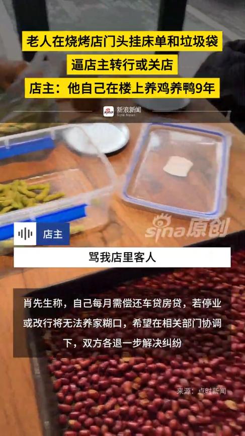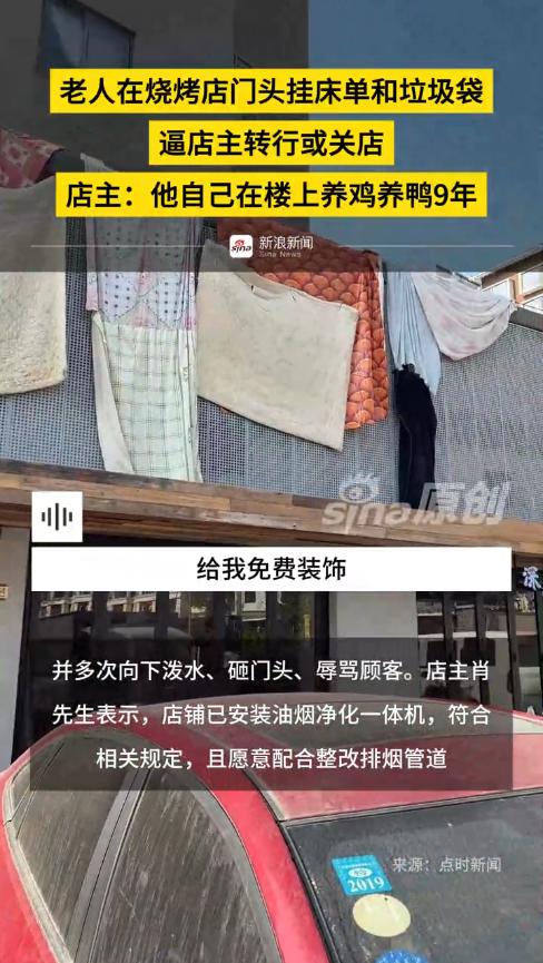 “必须严惩!”近日,浙江嘉兴,一男子在小区沿街开了家烧烤店,结果二楼的老人,以忍受不了油烟味为由,多次向下扔垃圾、倒水、挂被子,甚至还冲到店里辱骂顾客、服务员!逼着男子关店或者转行。网友:真没有人管吗? 现在很多小区沿街都有餐馆,居民回家时顺道就能买饭吃,非常方便,而至于能否开店,只要各种手续都齐全,那就没有问题。可据媒体12月27日的报道,肖先生刚开了一个月的店却险些倒闭。 肖先生在小区沿街开了家餐馆,可是刚开业不久,餐馆上方的招牌就被人挡住了,故意搞破坏的不是他人,正是二楼的一户住户。 两位老人原本在平层上养了鸡鸭,每天都要出来投喂,可是餐馆开业后,他们就能闻到一股刺鼻的油烟味,认为对健康有影响,于是就要求肖先生搬走。 沟通了几次后都没有效果,老人便开始自己想办法,每天把床单、被褥挂在外面,挡住餐馆原先的招牌,还会向下倒水、扔垃圾。 最过分的是,老人还多次来到店里面闹事,无差别的辱骂所有人! 肖先生表示,自己的所有设备都是符合标准的,而且店铺刚装修好营业,租金什么的都付了,如果搬走的话自己绝对会赔钱。 这件事引发了网友的热议,有人觉得就是老人无理取闹,如果不能在此营业,那些手续就无法批下来,既然人家手续齐全,那就没有权利干预! 信息来源:《浙江一餐馆门头挂满被子床单,店主称“楼上居民恶搞”,街道办介入调解》新京报