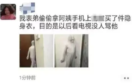 我表弟偷偷拿阿姨手机买了件隐身衣,目的是以后看电视没人骂他