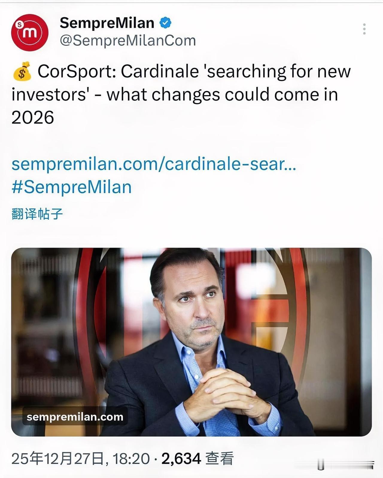 卡迪纳莱一直都在寻找新的投资者!随着卡迪纳莱在购买米兰时候向埃利奥特集团贷款日期的临近,卡迪纳莱寻求新合作者的意愿越来越强烈。 一年之前红鸟集团曾经偿还埃利奥特集团接近1.7亿贷款,现在红鸟集团在埃利奥特的贷款大概为4.89亿,算上利息大概为5.15亿左右,红鸟集团无力偿还这笔费用,卡迪纳莱从未放弃通过出售股权方式对米兰进行资产融资,但迄今为止没有找到合适的融资者。 之前融资不成功是因为没有新球场,PPT缺少关键元素,在过去几个月卡迪纳莱解决了圣西罗重建问题,也与NBA达成一致要打造欧洲NBA联赛,米兰投资价值上涨,现在就看卡迪纳莱能不能找到合适的接盘侠了,其实大家都清楚红鸟集团作为私募基金是不可能长期持有米兰的,好在卡迪纳莱资本运作成功,他等来了新圣西罗球场,比史蒂芬张运气好,后面就看有哪个脑袋大的愿意接盘了。
