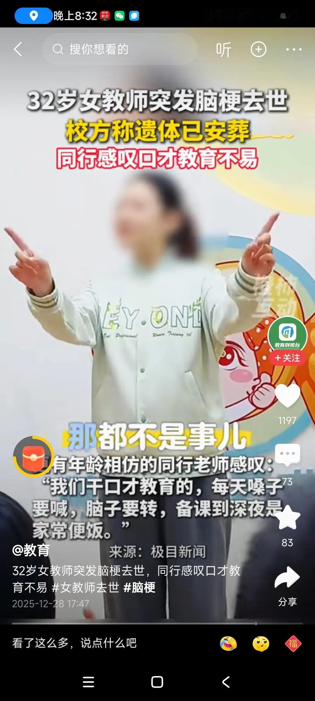 天空飘来五个字,那都不是事,这是女教师生前讲课时说的,教孩子们乐观面对世界。 谁知这个年轻女教师,学校开会时,脑梗去世,才32岁,英年早逝了,, 这个脑梗,与休息不好,睡觉少,压力太大有关, 我要是睡觉少了,脑子会难受,头痛,所以夜班的工作,给我一个月二万元工资也干不了,身体受不了,,, 大家千万注意休息,也不要注重名利,不去理会,,,不要想太多就好,, 什么今年没加工资, 什么奖金比别人少, 什么拍马屁领导喜欢,,, 这些都不重要,,,[捂脸][捂脸]