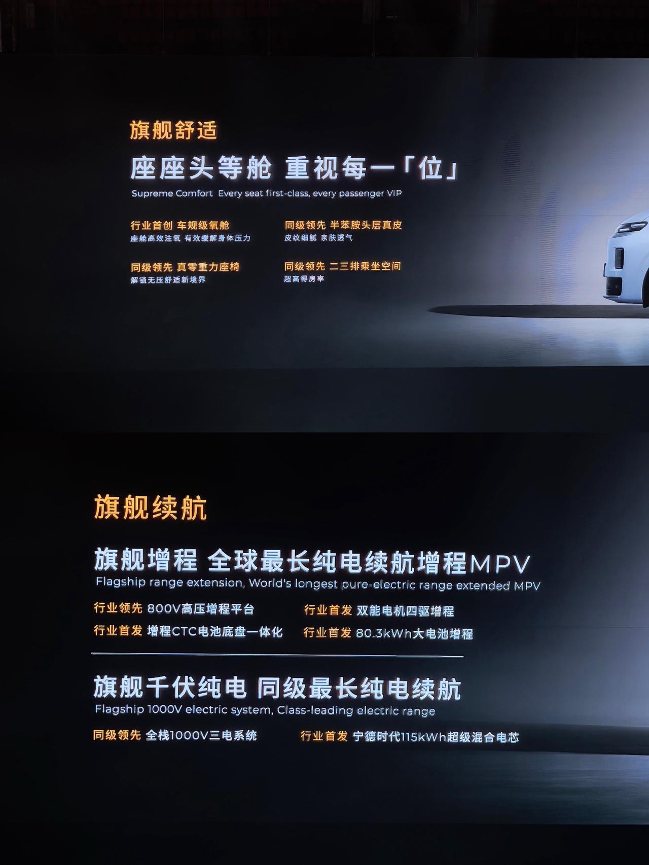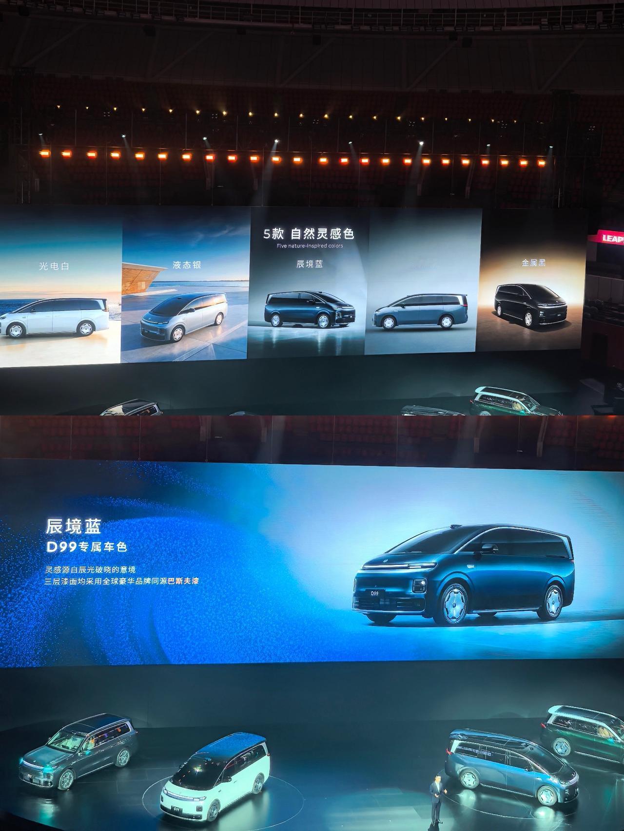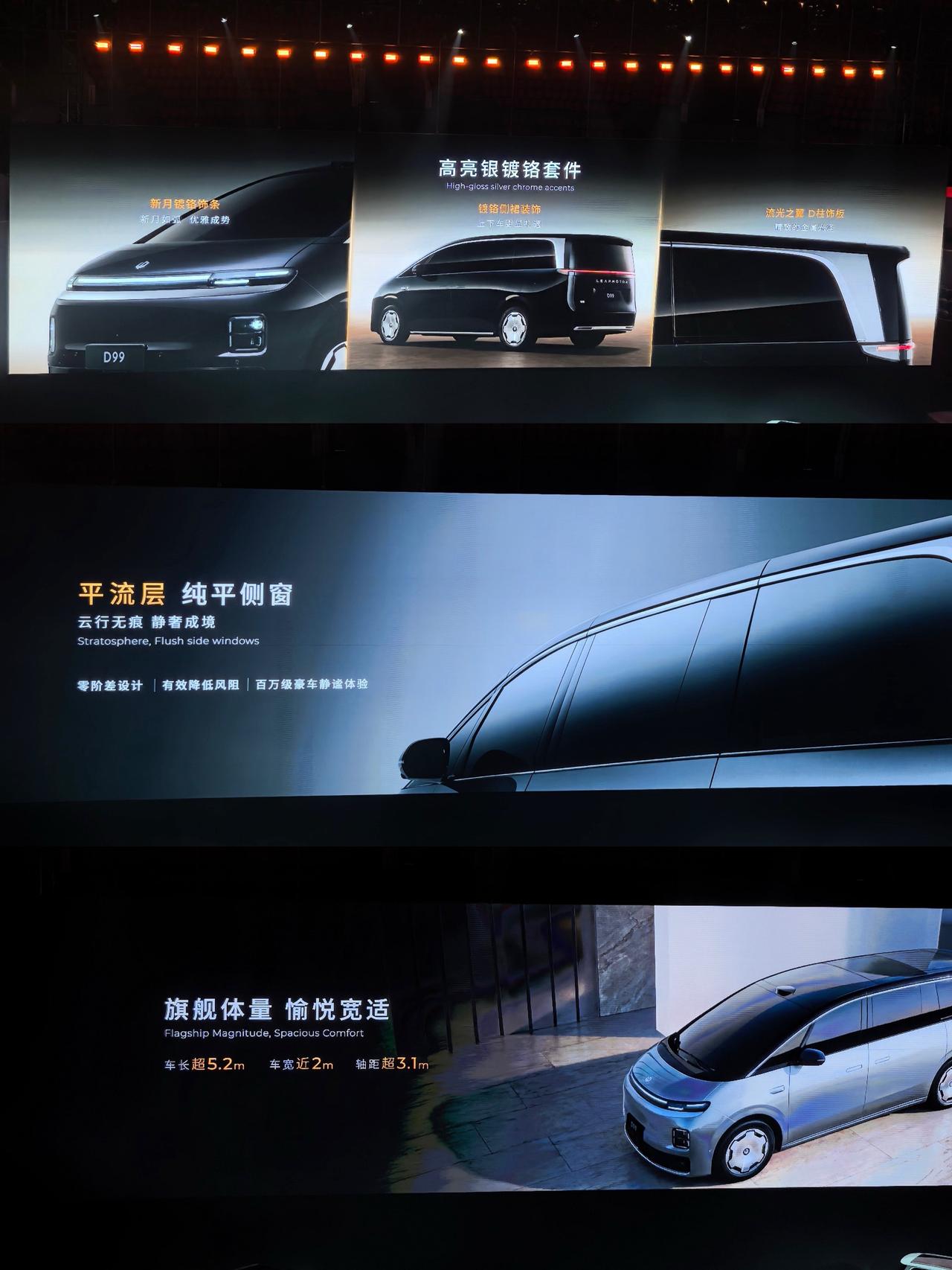 零跑D平台的MPV来了,也是目前零跑汽车的首款MPV车型,名字叫D99,双9的名字多少有些霸气了~ 这样以来,零跑汽车的D平台也正式开启双旗舰车型 从现场的简单介绍来看,目前D19车型会搭载的高级旗舰要素,比如说 1,车长超5.2米,车宽近2米,轴距超3.1米,高度不知道 2,D99在外观造型上还是非常迎合D系列家庭特征 三段式贯穿灯,智慧交互灯幕,纯平侧窗,高亮银镀铬套件(镀铬套件分布于全车5处,前脸、两侧D柱及侧裙)贯穿前后车窗的D形镀铬饰件, 智慧交互灯幕,基本上也和目前D19 在外观设计上的小细节都是一致的 3,前脸方面,官方用词是寰宇之境的前脸,圆润饱满 三段式大灯设计,下配高亮镀铬饰条 4,这次的天幕是1.46平米透光面积,我估计也是什么紫外线隔绝率>99.9%,这些话术基本也都差不多的 6,这次颜色方面目前给了5款,金属黑,电光白,液态银,辰境蓝,天幕灰;辰境蓝车型被放在中间,我估计D99的主推色就是辰境蓝了 此外,旗舰增程 全球最长纯电续航增程MPV 800V高压增程平台,首发双能电机四驱增程,首发增程CTC电池底盘一体化,行业首发 80.3kWh大电池增程, 同级最长纯电续航,全栈1000V三电系统 首发宁德时代115kWh超级混合电芯,行业首发1280TOPS 双8797芯片,这些虽然大家都不会太意外,但一旦放在一起的效果肯定也会不一样的~ 零跑 零跑MPV 零跑D99 dou是好车