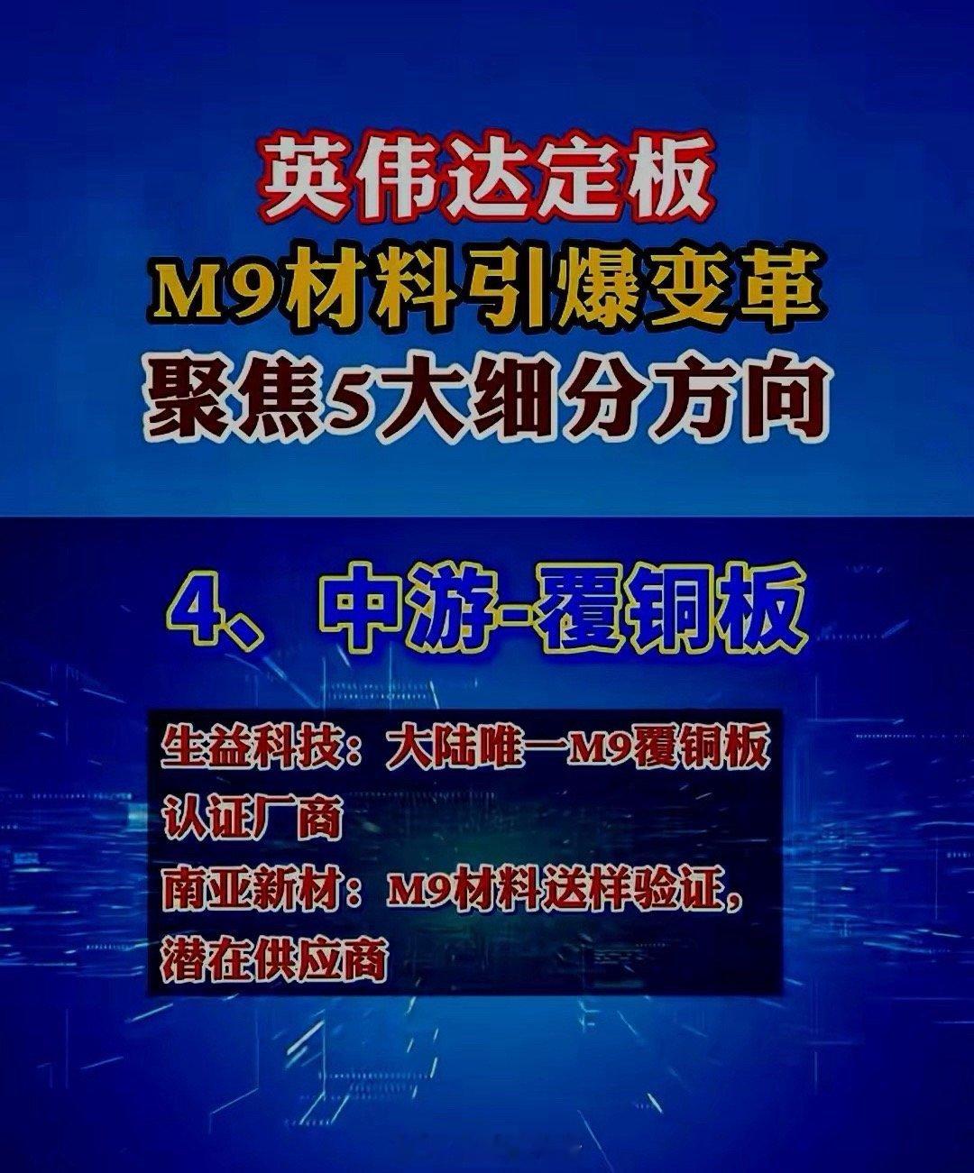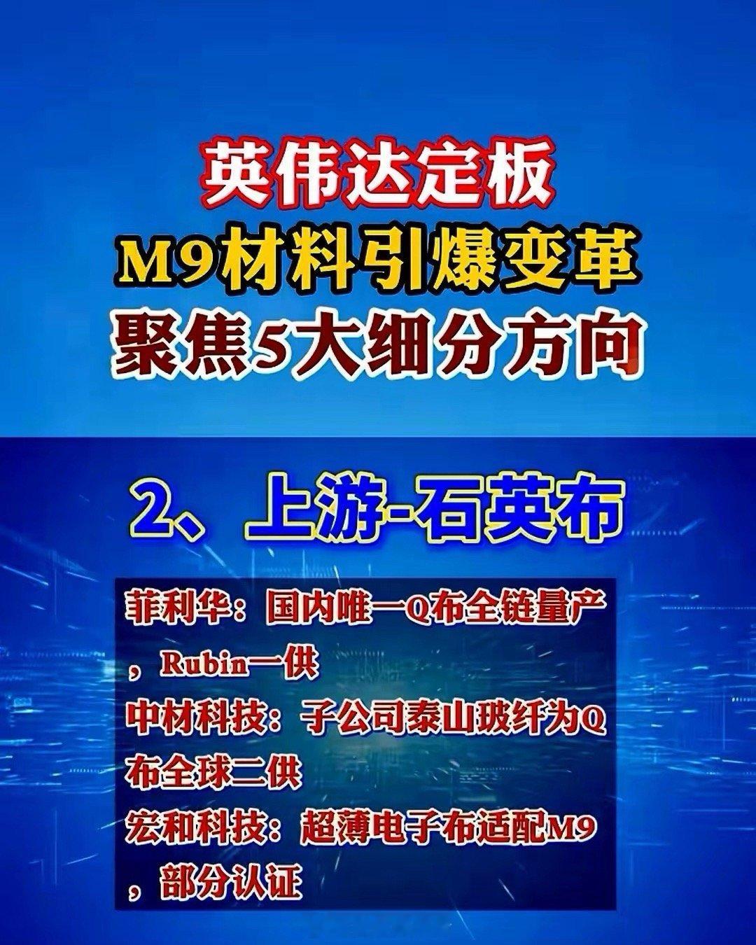 英伟达相关产业链受关注,M9材料领域聚焦五大细分方向:一是以上游树脂为核心,东材科技、联瑞新材、七彩化学等企业为代表;二是上游铜箔领域,以德福科技为典型标的;三是中游PCB板材,胜宏科技、沪电股份等占据重要地位;四是石英布领域,菲利华、中材科技、宏和科技为主要力量;五是覆铜板领域,生益科技、南亚新材表现突出。值得注意的是,近期铜材价格大幅上涨带动覆铜板市场价格飙升,生益科技有望从中直接受益。