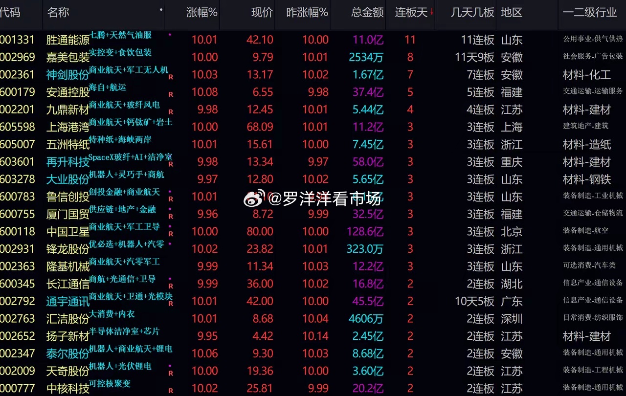 2025 年 12 月 26 日连板个股复盘商业航天领涨2万亿成交行情,高标锁仓+题材扩散双轮驱动12 月 26 日,大A延续强势格局,商业航天主线全面霸屏,成为当日绝对核心。三大指数震荡走强,两市成交额突破 2 万亿,较昨日放量 12%,情绪热度持续高位,超 3500 股飘红,80+股涨停,炸板率回落至 20% 以下,整体承接良好,日内赚钱效应突出,市场呈现 “主线明确、高标锁仓、题材扩散” 的特征。主线商业航天韧性拉满,连续三天掀涨停潮:神剑股份大单一字七连板,航天发展高开秒板后震荡回封,中国卫星趋势新高并实现三连板,通宇通讯、再升科技等多股跟风涨停,成为日内最确定的赚钱方向。板块轮动活跃,锂电池受消息刺激开盘走强,丰元股份一字涨停,天际股份竞价一字后分歧炸板再回封;有色金属(江西铜业逼近涨停)、大消费(银座股份首板、百大集团冲高)、芯片(亚翔集成五天三板创历史新高)、光伏、海南板块等前排标的轮番表现,大金融亦有小幅异动。尾盘资金抢筹,机器人概念首开股份深水翻红大涨,智能驾驶浙江世宝涨停,进一步提振市场氛围。12 月 26 日的连板个股呈现 “商业航天主线霸屏 + 高标锁仓 + 题材扩散” 的结果:胜通能源凭新逻辑成情绪锚点,神剑股份等商业航天标的批量晋级,3 连板及以下标的辐射至机器人、福建、核聚变等题材,体现资金 “拥抱主线、辐射关联” 的思路。高标延续超强连板(胜通能源 11 连板、嘉美包装 8 连板),商业航天标的批量晋级(神剑股份 7 连板、九鼎新材 4 连板、3 连板梯队近半为商业航天标的),同时海南自贸港、大消费、机器人等题材局部扩散,体现资金 “锚定主线高标、辐射关联题材” 的操作思路。操作上,延续 “重个股轻指数” 策略,聚焦符合优质标准的核心标的。主线商业航天核心前排未走弱前可持有,其他强势题材逢日内低点布局,在行情强势背景下,把握核心主线与轮动机会即可。后续需聚焦商业航天主线核心标的,优先持有神剑股份、中国卫星等实际业务标的,跟踪通宇通讯、长江通信等延伸标的;同时回避题材沾边的补涨标的,把握主线行情的延续性机会,直至板块出现明确退潮信号。