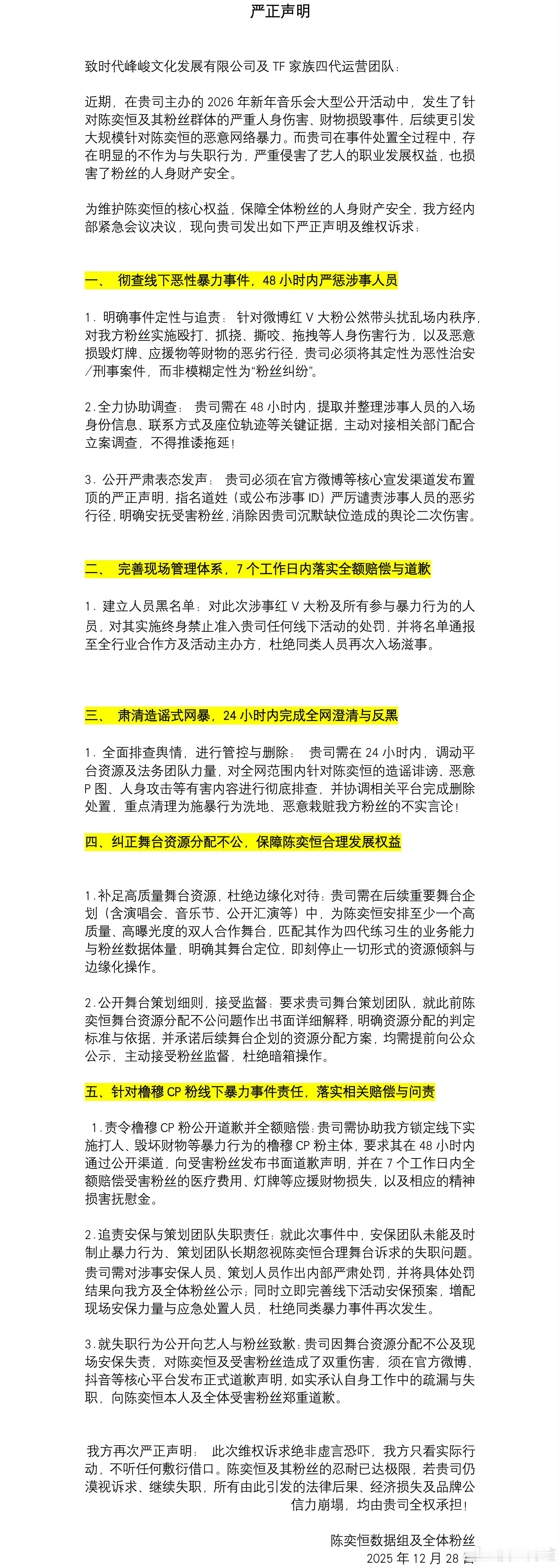 3天新音结束以后,陈奕恒粉丝维权声明来了