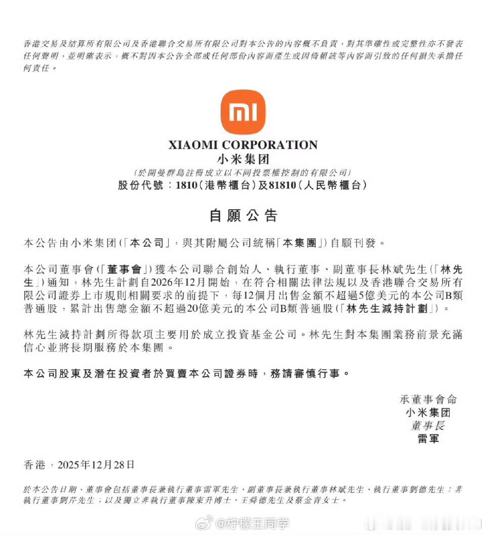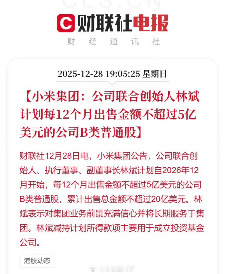 好家伙,怎么又有人在带节奏了,说林斌总要坚持小米股票,我这一看也不是现在啊,是从2026年12月才开始…小米联合创始人拟减持不超20亿美元还有一年的时间才开始减持,到那时候小米汽车的交付,小米手机业务、大家电业务等等早就已经进入了下一个level了,而且高管减持还是提前公告,建议所有公司都学习一下我看了一下林斌总的减持比例,只占小米的1%-2%,从一个万亿公司的联合创始人角度看,这个并不算多…大家还是消停消停吧