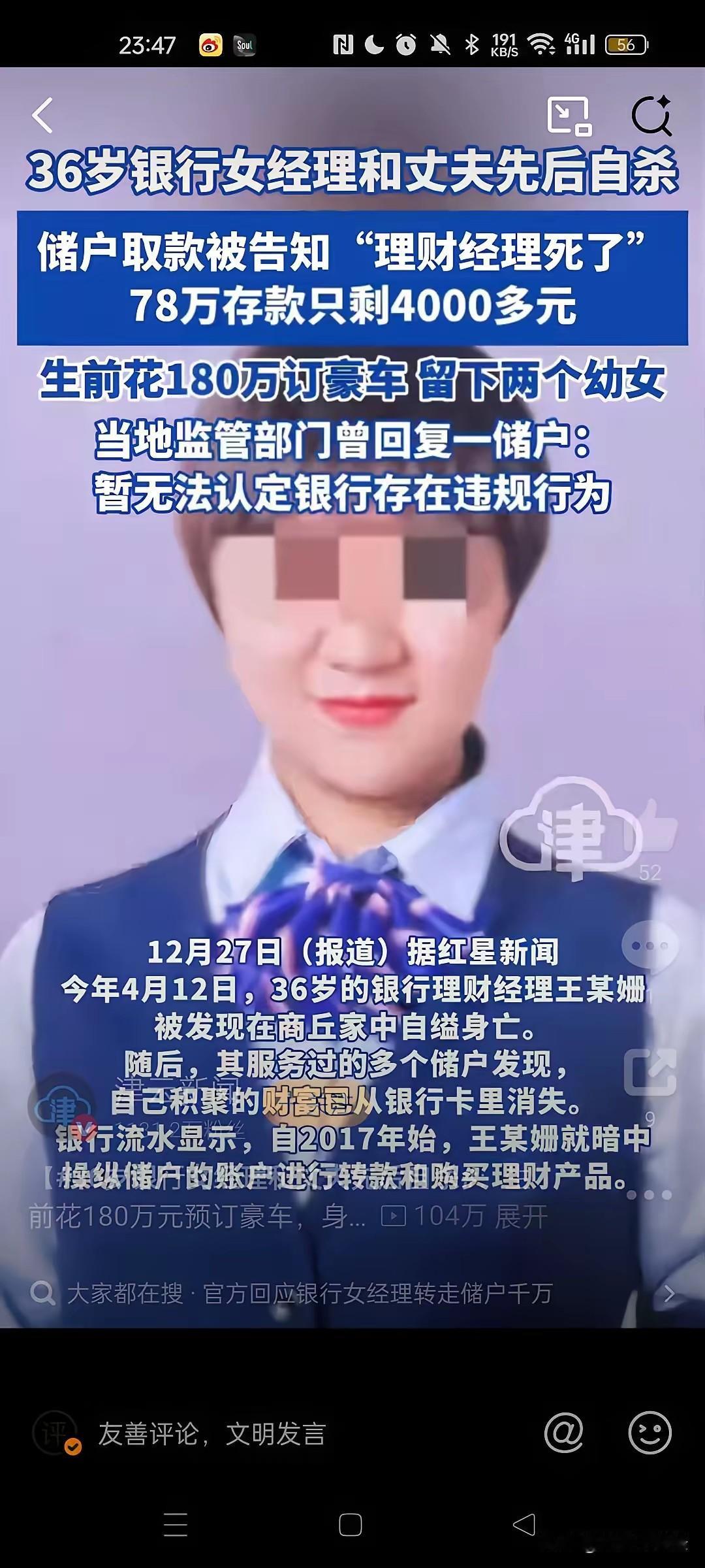 银行理财经理自杀,但是储户存款时不是到银行理财经理家里存的,是到银行办理存款的,所以银行应该负责任,银行不能因为理财经理自杀而推脱责任。 被骗的储户都是老年人,最小的也67岁了,最大的87岁,他们上银行存款,是先对银行的信任,其次是对这位微笑天使理财经理的信任。 由于现在银行存款在机器上操作,很多老年人不会操作,就给某些人钻了空子。 可这些老年人是无辜的,他们拿着一辈子的积蓄,怀揣着对银行的信任,把全部家当交给了银行,交给了理财经理,结果有的老人辛苦一辈子存的167万只剩下了600,有的老人78万只剩下4000,还有的老人所有的存款都没有了。 理财经理从2017年开始挪用储户的第一笔银行存款,到2025年4月银行才开始查银行员工个人存款流水,事情败露后,理财经理自杀,8个月后其丈夫也烧炭自杀,2017年到2025年,8年了,银行没有责任吗? 图自网络侵必删