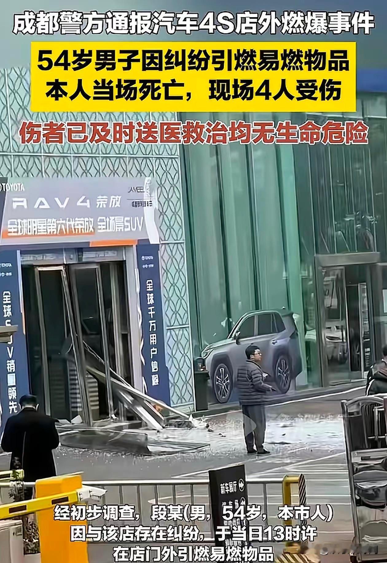 成都这一炸,把年关炸成了“难关”! 12月28日,54岁的段某绑着易燃物品在4S店外点了火。现场玻璃碎了一地,4个路人跟着遭殃,他自己更是当场就没了。 警方通报明确,事件发生在成都高新区南三环路四段一汽车销售店外,段某系成都本地人,因与店家存在纠纷,于13时许引燃易燃物品,致自身死亡、4人受伤,伤者均无生命危险。网传段某为矿场工作人员,纠纷疑似源于2万元购车定金退还,多次协商无果后走向极端,官方尚未确认具体纠纷细节。 据目击者描述,4名无辜伤者中,有人手部面部灼伤,有人头发烧焦、后背起泡。他们或是路过市民或是店内人员,本是寻常的一天,却要为他人的纠纷承受身心双重创伤,这份痛苦难以估量。 段某的极端行为绝不可取,但能让一个中年人放弃生命同归于尽,背后的绝望可想而知。中消协数据显示,2024年新能源汽车投诉量同比激增42%,其中销售纠纷占比高达43%,不少消费者因信息不对称陷入维权困境。 4S店的定金套路在成都早有先例。2025年6月,有消费者付1万定金买奥迪A5后想退,店家直言“慢慢耗”;7月,成都高新区保时捷4S店因合同不符拒退消费者定金,类似投诉从未断过。还有商家模糊“定金”与“意向金”,让消费者进退两难。 维权难才是悲剧的根源。黑猫投诉平台显示,2024年汽车领域投诉近2万件,同比增长63.4%,很多人因举证繁琐、处理周期长选择忍气吞声。第三方汽车鉴定费用从几百到上万元不等,普通消费者难以承受。 监管处罚力度不足也助长了乱象。根据《汽车销售管理办法》第三十二条规定,4S店违规最高罚款仅3万元,远低于违法收益,难以形成震慑。多数违规仅被警告或罚几千元,让商家有恃无恐。 段某点燃的不只是易燃物,更是对公平维权渠道的失望。54岁的年纪,上有老下有小,若非走投无路,谁愿走到这一步?但再大的委屈,也不能让无辜者买单,这是法律和道德的底线。 合法维权的路从未堵塞。湖北消费者提百万豪车两日漏油,7日内便通过消委调解解决;武汉车主遇车机断网,经调解获5000元现金券及3000元礼包。这些案例都证明理性维权能见效。 保存好合同、沟通记录等证据,通过12315、12345或消协平台投诉,才是保护自己的正道。极端行为只会制造更多悲剧,让家人陷入无尽痛苦。 这场血的教训,该唤醒商家的诚信、监管的力度和消费者的理性。年关本应团圆,别让消费纠纷变成无法挽回的遗憾。 各位读者你们怎么看?欢迎在评论区讨论。 成都伤人事件
