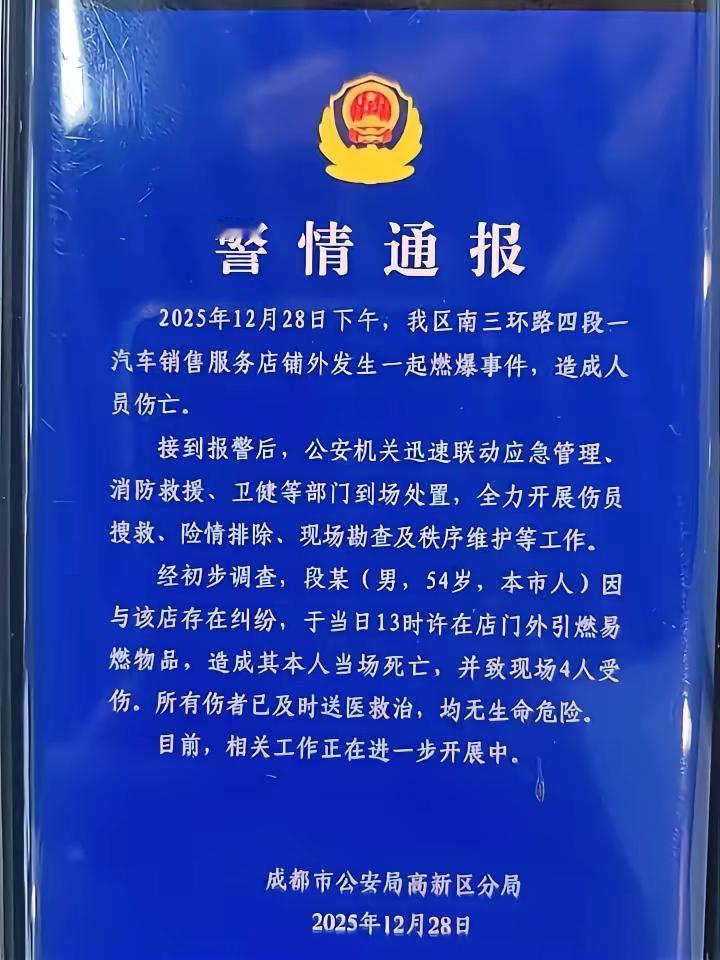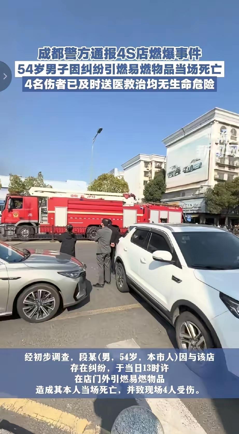 震惊!狠人一个!血性方刚!为了2万块钱定金纠纷,直接在4S店外引爆炸药! 成都54岁段某原来在当地4S店交定金买车,后来不想买了,结果交给2万块钱定金不能退了。 和4S店发生纠纷,这个段某竟然采取过激行为!制造了震惊的爆炸事件,自己身亡,还波及4个群众受伤! 冲动是魔鬼,要冷静,发生纠纷理性采取法律手段解决问题,生命可贵! 成都
