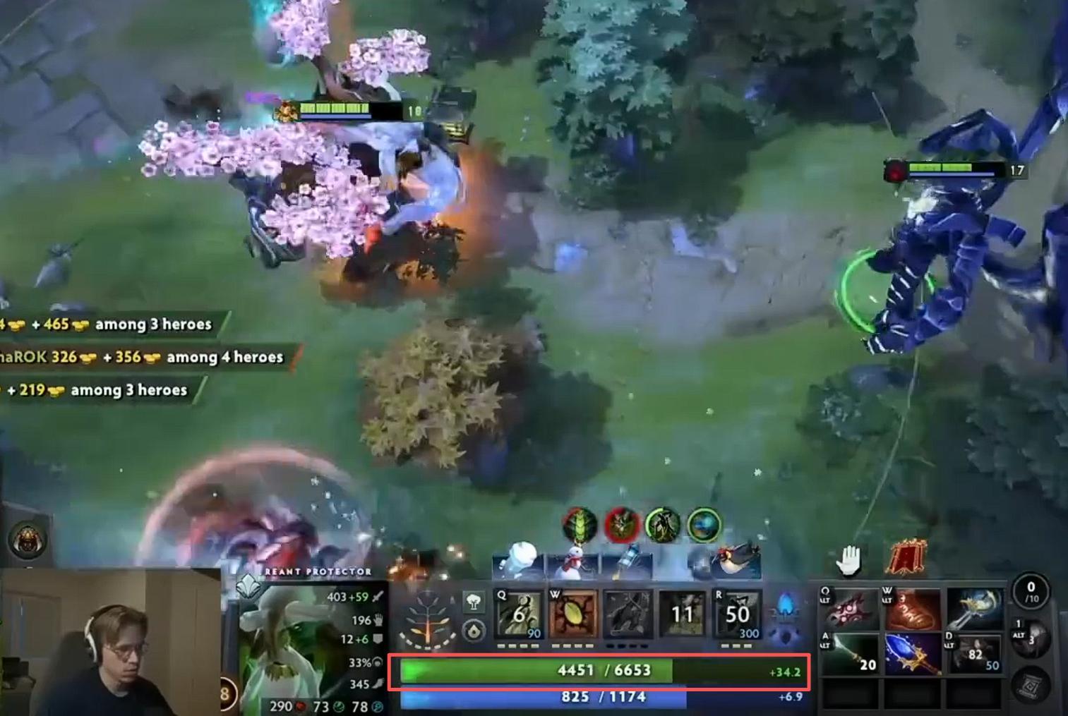Topson最近科研了一个中单大树的玩法,由于7.40大树A杖多了一个大招增加100%额外力量及攻击溅射的效果(类似尸王大+小小拔树的合体),这英雄在中期的战斗力得到了质的飞跃,比如配图的这局仅仅25分钟大树就已经达到了6600血和接近300点的攻击力,数值相当离谱,Topson的出装顺序是假腿-臂章-A杖-连击刀-BKB-强袭-鱼叉/大晕(根据局势调整),只要出到A杖就是强势期,中期打团可以无脑冲对面脸根本不知道死字怎么写,缺点就是碰到节奏缓慢的对刷局大树的打钱能力偏差,所以需要选手具备比较强的节奏感