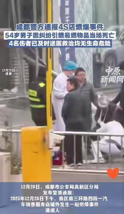 悲剧!成都一家 4S 店发生爆炸,嫌疑人当场死亡。 谁能想到,一条人命、四人受伤的惨剧,竟源于两万块买车定金?54岁大叔凑不齐尾款想退钱,跟4S店磨了好几回都被拒,一时钻了牛角尖竟引爆炸药,把自己的人生彻底炸没了。 其实这事儿真不至于走到绝路!法律上“定金”不退确实有依据,但“订金”能随便退,就差一个字,结果天差地别。而且就算是定金,也能找消协投诉、跟商家协商,实在不行走法律途径,总有解决办法,犯不着拿命去拼。 更让人唏嘘的是,好多家庭明明不宽裕,却非要跟风买车充面子,最后被欲望牵着走,一点小事就酿成无法挽回的悲剧。面子哪有命金贵?冲动解决不了问题,只会给家人留下一堆麻烦,还得在遗产范围内替他赔偿损失。 这事儿到底是4S店太强硬,还是大叔太冲动?你觉得遇到这种定金纠纷,该怎么处理才靠谱?
