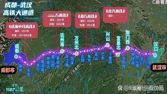 成都去武汉不再绕重庆:4小时直达,计划2027年跑起来。 成都起步,经简州、乐至、遂宁、南充、营山、渠县、达州、开江、岳西、万州、云阳、奉节、巫山、巴东、青山、宜昌、当阳、荆门、钟祥、天门,终到汉口;约1187公里。 成渝中线、成达万、郑万、宜兴、武夷拼接成一条高速通道,设计时速350—400km/h;其中武夷段今年、宜兴段2026,其余计划2027同步。 我的态度很直接:这是一场效率革命,不是谁“被绕”的面子。 直连成都—武汉,沿线城市能更快接上大圈层;真正的胜负在票价、班次和准点率,别再把“路过”当荣耀。 你家在这条线上吗?通车后第一顿,你准备吃热干面还是火锅?