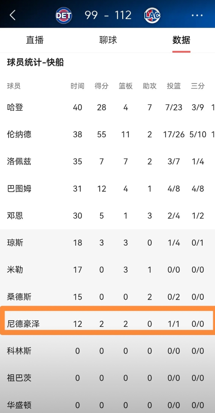 我强烈建议快船主帅泰伦-卢多给尼德豪泽一些上场时间!在今天快船主场以112:99战胜活塞的比赛中,小将尼德豪泽替补出战12分钟,投篮1中1得到2分2篮板1抢断,出现了4次犯规。
