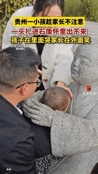 好奇心惹的祸!石像“抱”住孩子不放手?爸妈边笑边救! 一对夫妻带着3岁的儿子在公园玩,石像造型是双手环抱在身前,臂弯里正好有个空隙。 小孩看着好奇,趁爸妈在旁边说话的功夫,一扭头就钻进去了。结果,进去容易出来难——头被死死卡住,动弹不得。 孩子在里面急得直哭,身子在外面扭。爸妈回头一看,又吓又急,可那场景实在有点让人哭笑不得:石像像个固执的老爷爷,紧紧“抱”着孩子不肯撒手。 周围的姐姐和路人都围过来,有人出主意“往下蹲试试”,有人开玩笑说“快挠石像胳肢窝”。 孩子爸爸没敢硬拽,双手护着孩子的头,慢慢引导他下蹲、调整角度。试了好几次,孩子才终于从石像怀里“滑”了出来。 万幸,孩子一点没受伤,缓过劲来就又活蹦乱跳了。 孩子妈妈后来回应说,他们当时就在旁边聊天,并没看手机,但一眨眼的功夫,意外就发生了。 有网友调侃,这石像是“等了上万年,终于抱到个娃”。 有一说一,万一孩子真卡住了,千万别生拉硬拽,可能造成二次伤害。 像这爸妈这样,冷静尝试引导是对的。如果自己解决不了,赶紧打119,专业消防员有工具也有方法。 孩子救下来后,也别光顾着责备他调皮。孩子受了惊吓,更需要家长温和的安抚,帮他慢慢从害怕的情绪里走出来。