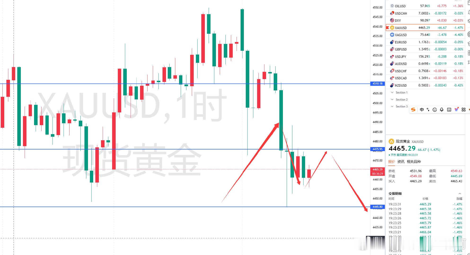 美市行情分析;黄金在白盘跌破4500关口时,就已经向市场传递出来了要走月末调整行情!随后黄金在午间加速下行至4445位置!我们虽然午间第一单被拉损下来但是即使调整思路后续又精准布局多单,短短1小时内来回收割600多余点!回归到目前4小时行情结构表现!黄金在第一次触及4445后反弹测试4475此位置短时间已经成为了压制点位,然后就是4488位置破后才有走出重新回到4500上方的势头,当然在美阶段回暖力度不够,后续将会继续走回落,去往4430一线!晚间优先关注此两个点位去做空!午间布局的4466空,在4457位置减后拿下90点,目前触及保本损!结束本次布局!后续等晚间机会即可!黄金 金价