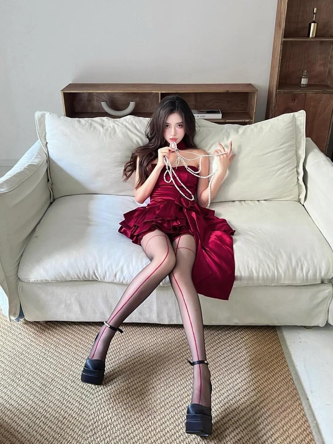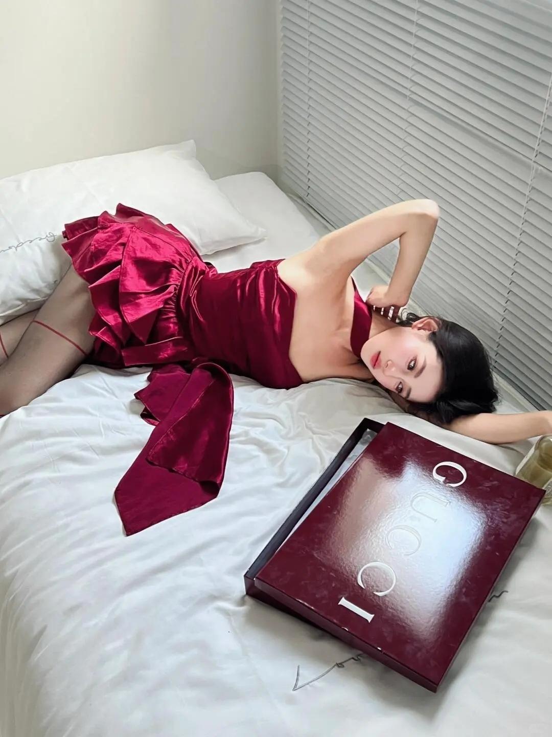 少女摄影|NO.0216期 酒红丝绒裙少女 慵懒又明艳的卧室氛围感随拍