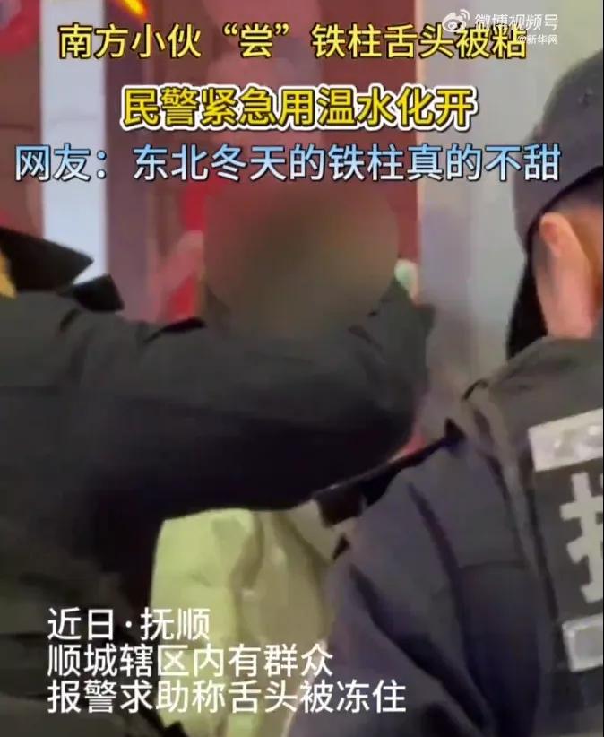 好奇心害死猫! 你说别试,我偏要试!东北铁柱子到底啥味?民警都笑了。 近日,辽宁抚顺一个派出所的电话响了,那头报警的人说得有点含糊,但有点着急道:舌头被冻住了,拔不下来了。 民警一听,心里大概有数了。这大冬天的,估摸着又是哪位“勇士”去挑战物理学了。 他们也没耽搁,顺手就准备了一壶温水,开车直奔现场。到地方一看,果然,一个小伙子正以一个特别别扭的姿势站着,脑袋凑在一根铁柱子旁,动弹不得。 接下来的救援倒不算复杂,民警把带去的温水,慢慢地浇在铁柱子和舌头粘住的地方。冰一遇到温水就化了,小伙子的舌头总算下来了。 救下来之后,民警看着这位勇敢的小伙,也是又好气又好笑,忍不住问了那个所有人都想知道的问题:“你为啥要去舔它啊?” 小伙子的回答,让见识过各种场面的民警都愣了一下。他有点不好意思地说:“我对象说舔电线杆子舌头拔不下来,我就试一下。” 原来,他就是想亲自验证一下女朋友说的话是不是真的。民警听完,大概明白了,回了一句:“你不是东北人啊?” 一句话点破了这出“惨剧”背后的核心原因,一个对东北严寒物理特性缺乏了解的南方人,那份纯粹又“致命”的好奇心。 事情传到网上,网友们都乐了。有人说,东北冬天的铁柱,真的不甜,别尝了。 也有人说,怎么年年冬天都有“不信邪”的朋友,用自己去做这个实验。更有人笑着承认,自己小时候也干过类似的傻事。 说起来,人好像总会被这种“禁止触摸”的警告吸引。 别人越说“别试,会粘住”,心里那个“万一不会呢”的声音就越响。这倒不全是傻,更像是一种植根在好奇心里的、对自己亲身经验的执着。 有时候,道理听了一百遍,不如自己碰一次壁记得牢。换作是我,我也会高低得试一下,哈哈哈。你们呢?朋友们,想不想试一下?