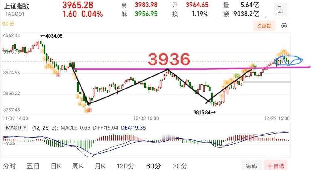 关键点3936不变,不破仍是强势震荡。今天大盘是一个冲高回落走势,总的在预期之内,毕竟九连阳,接近4000点压力区,也该喘口气,对量的要求也越来越高,缩量就容易留有上引线。技术面看,30分钟顶背离,分时结构也有拉回的动作,拉回的关键点还是3936,只要不破3936颈线,还是强势的震荡走势,所以走势的要求很简单,保持3936上方震荡都是可以接受的,总的来说震荡完成,后续继续向上概率大。具体细节,关注收评!