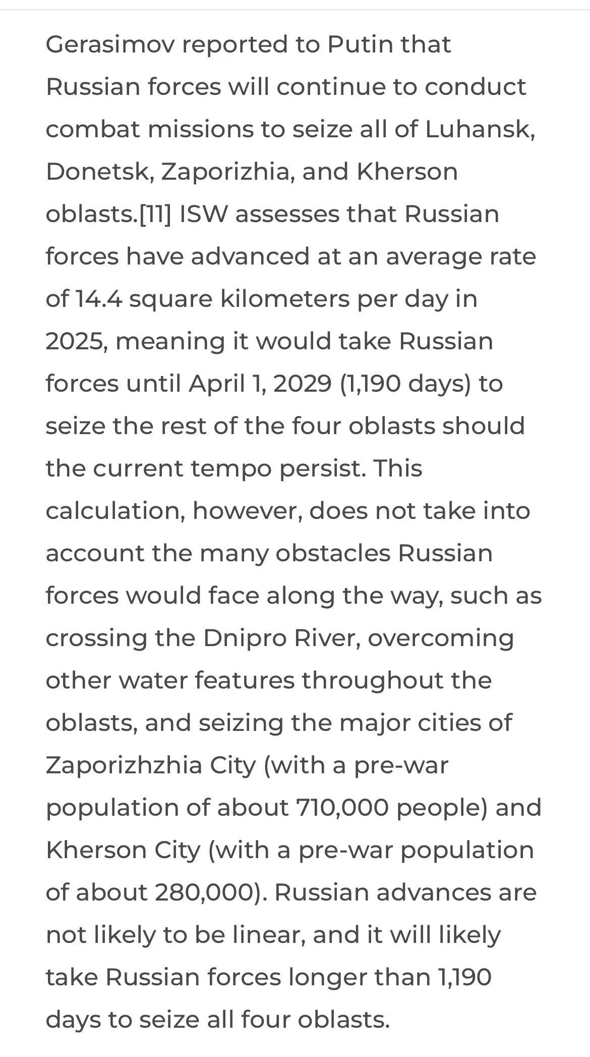 美国战争研究所报告:2025年,俄罗斯军队的平均推进速度为每天14.4平方公里,这意味着,如果按目前的速度推进,俄罗斯军队需要到2029年4月1日(1190天)才能完全占领四个州的全部领土。然而,这一计算还没有考虑到俄罗斯军队在推进过程中要面临的许多障碍,包括渡过第聂伯河等。而且,俄罗斯的推进不太可能是线性的。