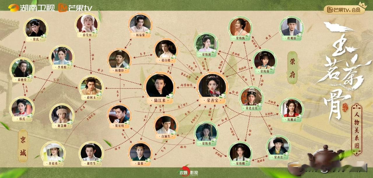 《玉茗茶骨》的故事以江南茶道世家荣家为核心,采用“女尊雄竞”的设定展开。 大房有大小姐(女主古力娜扎)、老四和老六;二房是老二(程潇);三房有老三和大少爷;四方是老五。此外,还有个表小姐,她母亲本是荣家人,但嫁出去后就不姓荣,成了外姓人。 这几位小姐的母亲大概率是荣家小姐招婿所生,所以小姐们都姓荣。 陆江来(侯明昊 饰)本是年轻状元,失忆后被贬为荣家马夫。从人物关系图来看,他身世应颇为不凡。 “一女对战七男”的招赘之争 荣家公开招赘,引发了家族内外的权力争夺。这使荣善宝置身于七位竞争者(剧中呈现为“九男追一女”的雄竞局面)的中心,也让陆江来被动卷入,沦为各方势力博弈的棋子。 家族内部:姐妹间的权谋暗斗 荣善宝并非没有内部敌手。家族中的姐妹们(如程潇、张楠等饰演的角色)各有盘算,与荣善宝存在竞争关系,构成了家族内部的权力暗线。