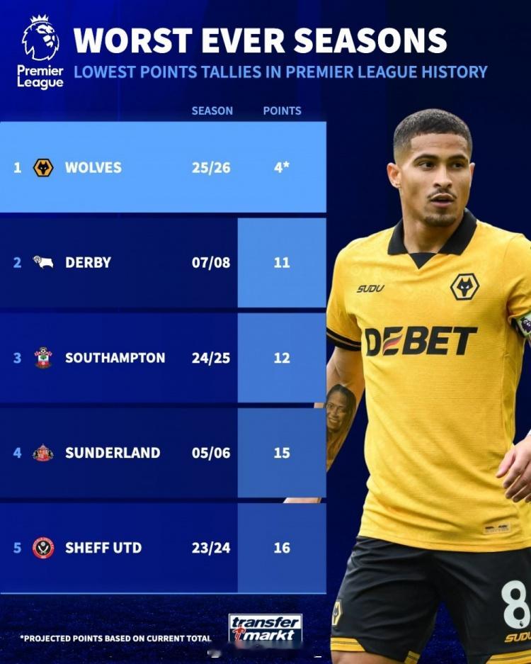 英超历史单赛季最低总积分:1.狼队(25-26赛季),4分(预计)2.德比郡
