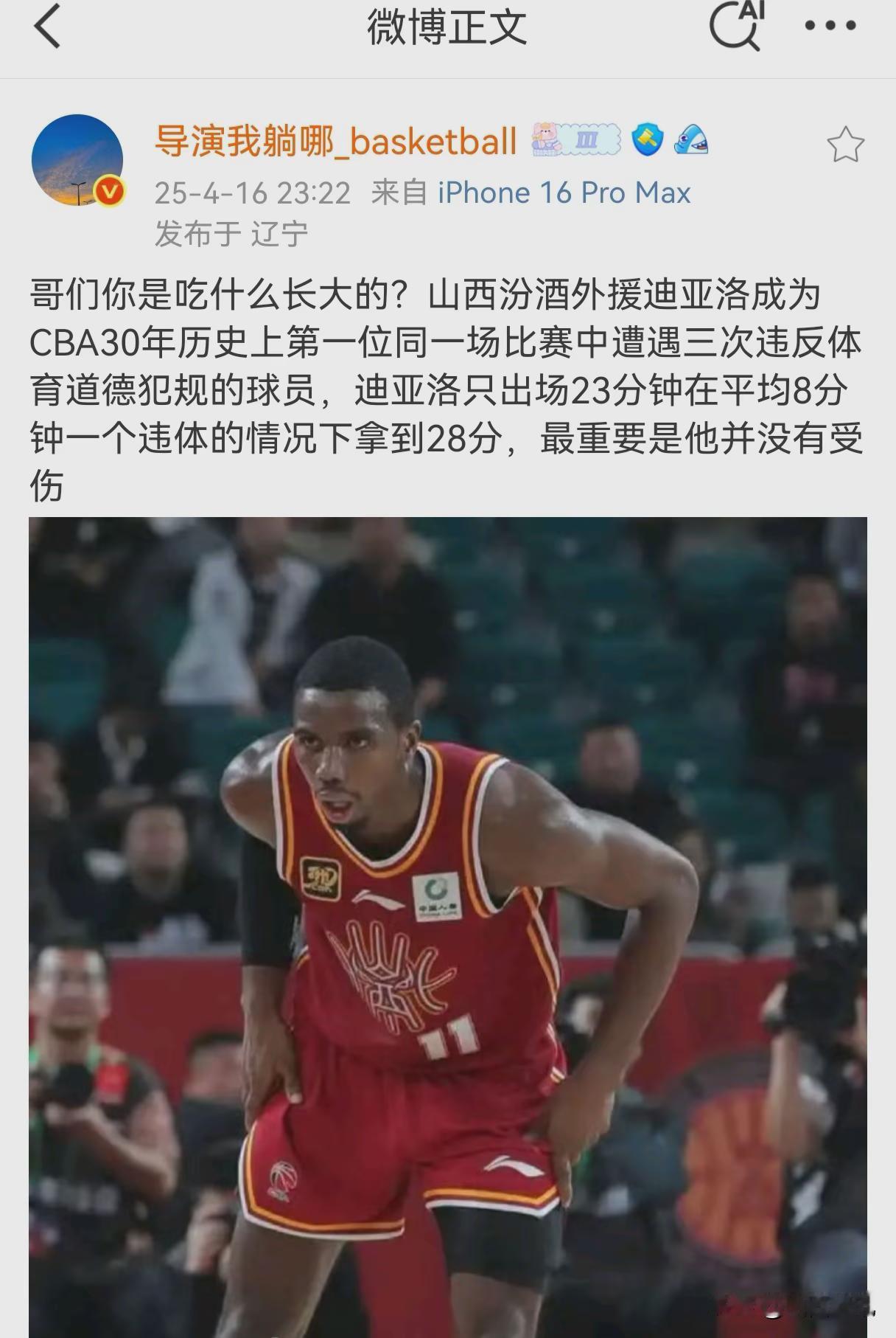 迪亚洛疑似谈自己的犯规离场! 迪亚洛在与广东男篮的比赛中,出场16分钟得到9分7板4助攻2抢断1盖帽,正负值-13,全队最低。本场比赛,迪亚洛罕见五犯离场,特别是第五次犯规是主动找萨林杰要的犯规,球迷对此不解,迪亚洛赛后在不公开场合透露自己的心声。 第一,与杜锋指导比心的动机。冤家宜解不宜结。主动向杜锋指导示好,是职业球员应该具备的素质,希望他在布置战术时,不要有“杀迪”密令。请他对我手下留情。 第二,犯规离场分原因。上赛季一场比赛领教了广东男篮三次违体犯规,有幸成为CBA历史第一人深感荣幸。第一次被冲篮张皓嘉拉拽倒地脚痛。第二次胡明轩横撞倒地腰疼。第三次杜润旺肘击头疼。从头到脚没有不疼的地方。想起来都后怕。本场比赛中,王少杰领命使肘,看的出“比心”示好都没用。广东男篮在暂停时指导发话了,“要犯规就狠一点”,结合徐杰之前说的“打架和摔跤”,觉得还会下重手,所以主动对抗犯规离场吧,潘指导让我最后时刻逆转比赛,想一想还是放弃吧,免得留在场上被对方干伤。留的青山在,不怕没柴烧。