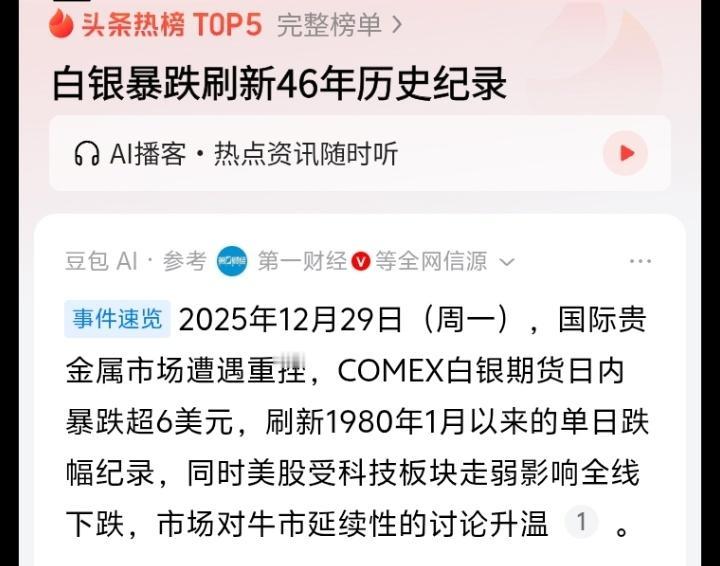 白银一夜“雪崩”创46年纪录!你的钱包在“过山车”上尖叫了吗?揭秘资本游戏背后的人性贪婪与恐惧 昨夜,无数投资者的手机被一条消息刷屏:国际白银价格暴跌超8%,单日跌幅刷新1980年以来的历史纪录。冰冷的数字背后,是无数人一夜之间的心跳加速与账户缩水。这不仅仅是一次市场的正常波动,更像是一场资本精心导演的“压力测试”,测试着每个普通人面对财富涨跌时,那份最原始的人性与抉择。 当白银从高点飞流直下,市场上弥漫的不仅是恐慌,更是一种诡异的沉默。有人在高位套现,笑看风云;有人却深陷其中,彻夜难眠。这暴跌的6美元,砸穿的不仅是K线图上的支撑位,更是许多人心里那道脆弱的防线。我们总说“投资有风险”,但当真金白银开始蒸发时,那份痛感才如此真实而刺骨。 同步下跌的,还有一路高歌的美股科技板块。特斯拉、英伟达等明星股纷纷收跌,市场仿佛突然被泼了一盆冷水。这不禁让人反思:当全球资本都在追逐少数几个科技巨头时,泡沫是否早已在狂欢中悄然滋生?牛市的故事还能讲多久,或许连最乐观的分析师也开始暗自掂量。 回过头看,白银这轮暴涨暴跌像极了一场人性的寓言。上涨时,人们蜂拥而至,谈论着货币贬值、实物稀缺,仿佛错过就是罪过;下跌时,同样的理由却成了“多杀多”的借口。市场永远不缺故事,缺的是在故事中保持清醒的头脑。那些高喊“还要涨”的声音,与紧急止损的指令,在同一时空激烈碰撞。 普通人在这样的巨震中该如何自处?是跟着情绪追涨杀跌,还是冷静审视自己的承受底线?资本市场的每一次剧烈波动,本质上都在重复同一课:你永远赚不到认知以外的钱,也躲不过人性弱点带来的代价。当屏幕上的数字跳动,真正被考验的,其实是你的心态与格局。 有趣的是,在白银与美股调整的同时,国际油价却在悄然走高。资金就像水流,永远在寻找价值洼地与安全港湾。这种分化提示我们:单一资产的狂欢往往不可持续,健康的投资需要更广阔的视野。别让眼前的红绿线,局限了你对世界的判断。 临近年底,市场进入传统的“圣诞老人行情”窗口,但这次暴跌无疑给乐观情绪蒙上了阴影。是牛市的短暂喘息,还是转折的开始?或许答案并不重要。重要的是,我们能否从每一次波动中,看清自己是在投资,还是在赌博;是在规划财富,还是在追逐幻影。 这场46年一遇的白银暴跌,终将过去。但它留下的思考,却值得每个触摸过投资的人反复咀嚼。你的财富旅程,是跟着市场情绪随波逐流,还是有自己的节奏与锚点?当潮水退去,愿我们都不是那个慌张裸泳的人。 (来源:综合第一财经、华尔街见闻、期货市场数据及公开交易记录) 白银暴跌 投资心态