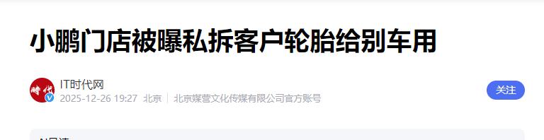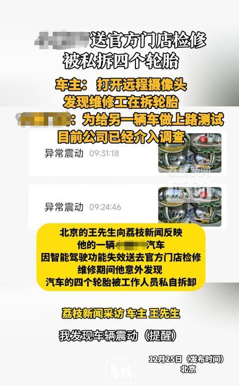 12月25日报道,北京一男子将车送去维修,不料,手机突然收到提示,他打开摄像头一看,自己车上的4个轮胎,竟被维修人员硬生生拆了下来!他当场愣住,男子下意识点了录屏,顺手拨门店电话。前台说是借用一下测试,十几分钟就还。他追问谁授权,对方却支支吾吾,说是师傅临时安排。 现在的汽车,早不只是用来代步的交通工具了。带联网功能的智能监控,让它成了车主的“千里眼”。也偏偏是这双眼睛,把修车行业里藏了多年的猫腻,彻底摆到了明面上。 12月25日,北京的王先生遇上了一件让人气愤的事。他在家好好坐着,手机突然弹出车辆异常震动的警报。 点开远程监控画面一看,他瞬间火冒三丈,本该在维修车间检修的爱车,正被维修工熟练地拆着轮胎。 画面里看得清清楚楚,维修工把他的车胎拆下来后,直接装到了旁边另一辆车上。 以前车主把车送修,交了钥匙就等于交了控制权,车间里发生什么全靠猜。零件有没有被挪用、有没有被以次充好,全凭技师的职业操守,车主根本没处查证。 但现在,智能监控系统直接打破了这种信息差,让车主终于有了对等的话语权。 面对监控铁证,维修店给出的解释是“临时借用测试”。这个说法不仅站不住脚,更把行车安全当儿戏。 轮胎拆装从来不是简单的“拆下来装上去”,涉及扭矩锁紧、胎压匹配、动平衡调试等多个关键步骤,每一步都不能马虎。 王先生后续检查发现,自己车上的传感器编号对不上,动平衡块也被挪动了位置。这种私自换胎的操作,很容易导致高速行驶时爆胎,维修店分明是用别人的生命安全,来填补自己的管理漏洞。 更让人警惕的是,这件事背后,已经形成了行业内逃避监管的“潜规则”。有不少维修门店,已经开始研究怎么遮挡车辆摄像头,或者想办法断开车辆的联网模块。 王先生车上关键位置的监控刚好出现故障,大概率就是这种操作的结果。他们不想着靠提升技术、规范服务赢信誉,反而一门心思要把修车过程重新拉回“暗箱操作”的阴影里。 虽然《消费者权益保护法》里明确规定了赔偿细节,但对车主来说,维权的成本依然高得离谱。 从报警固定证据,到找第三方机构检测定损,王先生前前后后跑了无数趟,过程格外艰难。这种“取证容易、定损难、获赔慢”的现状,恰恰成了违规事件频发的温床。 如果违规的代价远低于收益,商家自然不会主动自查自纠,只会想着能糊弄一次是一次。 在万物互联的当下,维修店早就不是信息封闭的孤岛了。硬件技术在升级,服务流程的透明度也得跟上,这样车主才能真正放心把车交出去。 更重要的是,法律的刚性约束需要进一步落地,把车主维权的琐碎成本降下来,让违规商家付出实实在在的代价。 最后也提醒大家,以后送修车辆时,多留意手机上的实时监控画面。这是科技给我们的保障,更是守护自身财产和生命安全的最后一道防线。 信息来源:《小鹏门店被曝私拆客户轮胎给别车用》,it时代网,2025年12月26日。