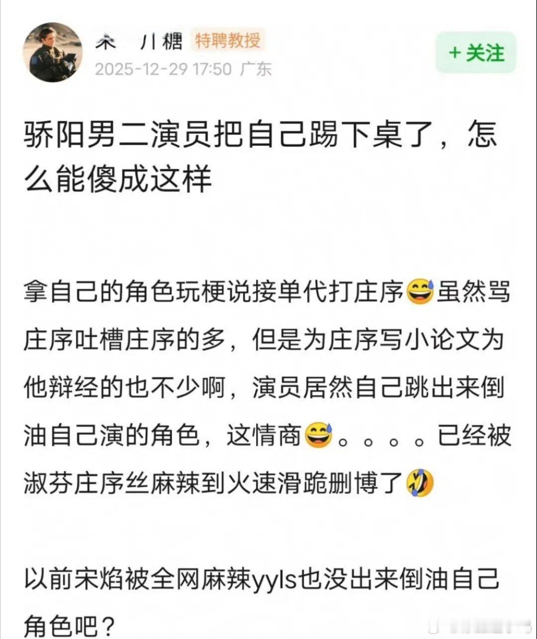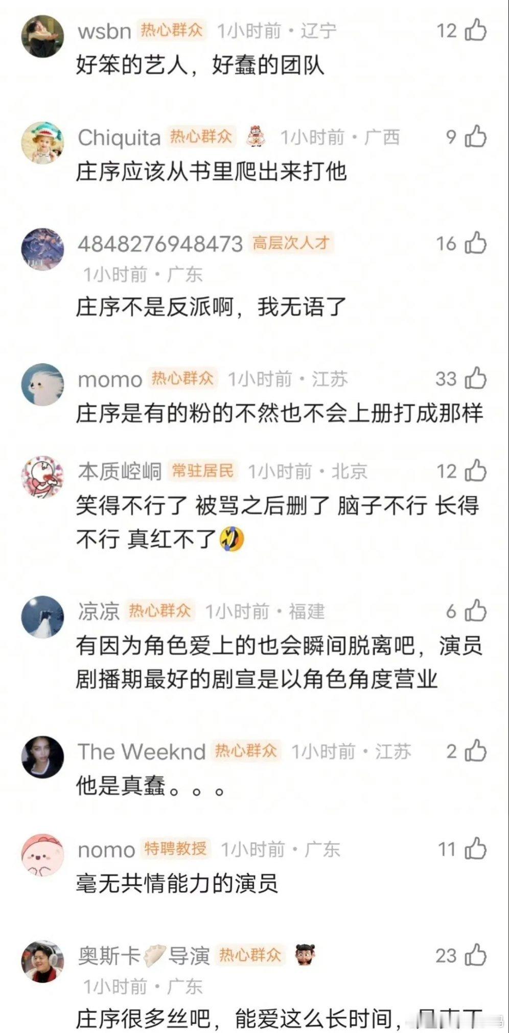 骄阳里的男二赖伟明,这波操作真是把自己坑了…他自己发了个文,玩梗说自己“代打”庄序,结果书粉和角色粉直接炸了。一个演员主动贬低自己演的角色,这情商也太低了吧。其实庄序这角色也不是反派,挺复杂的,不是那种一眼看到头的深情男二,更像现实里那种不那么完美的男生,正因为不完美,才显得真实鲜活啊。不管是原著还是剧里,庄序都有不少人喜欢。赖伟明这么拿角色玩梗,既不尊重角色粉,看来也没真正理解这个角色。现在他倒是把那条微博删了,但网友们对他这做法还是挺反感的,不买账。