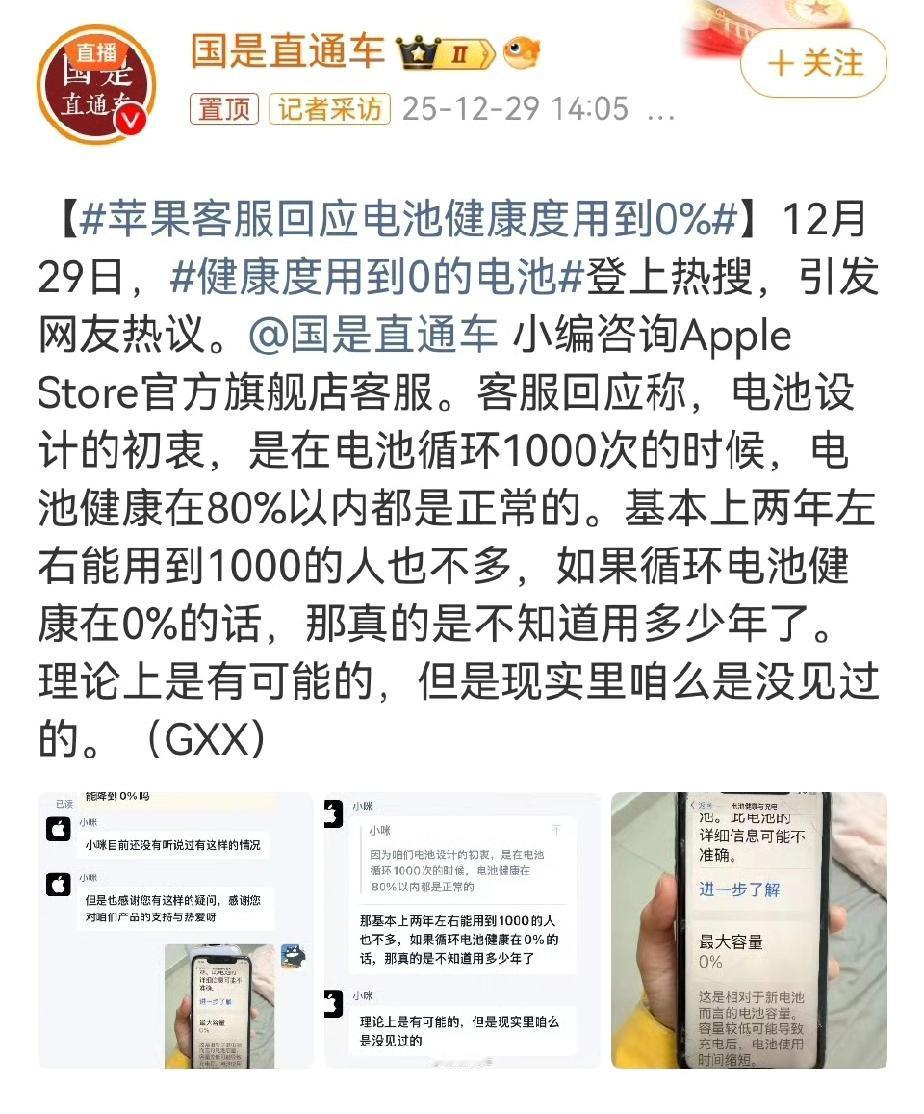 苹果客服回应电池健康度用到0%,成为热门话题 ,能把手机用那么多年的怕也只有iPhone 和华为了。我只见过用5年以上的苹果和华为用户,别的手机都做不到吧。 要知道手机电池设计的初衷,是在电池循环1000次的时候,电池健康在80%以内都是正常的。基本上两年左右能用到1000的人少之又少,如果循环电池健康在0%的话,那真的是不知道用多少年了。 手机常年使用不卡顿,保持长期流畅,是一个世纪难题。 我一般两年换手机,你们一般多久换一次手机呢?