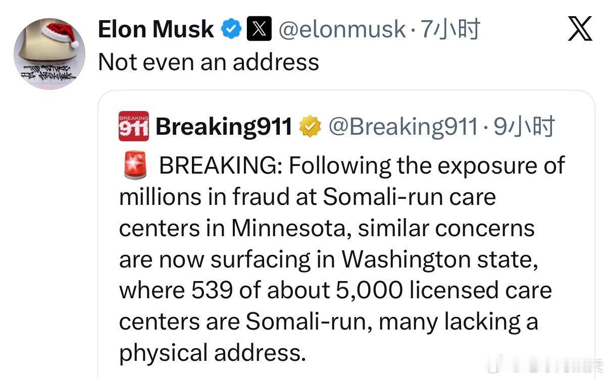 ‼️马斯克评论:“连地址都没有”🔻继明尼苏达州索马里人经营的护理中心被曝光数百万美元的欺诈行为后,华盛顿州也出现了类似的担忧,该州约 5000 家持证护理中心中有 539 家是索马里人经营的,其中许多没有实体地址。热点现场海外编译精选海外新鲜事
