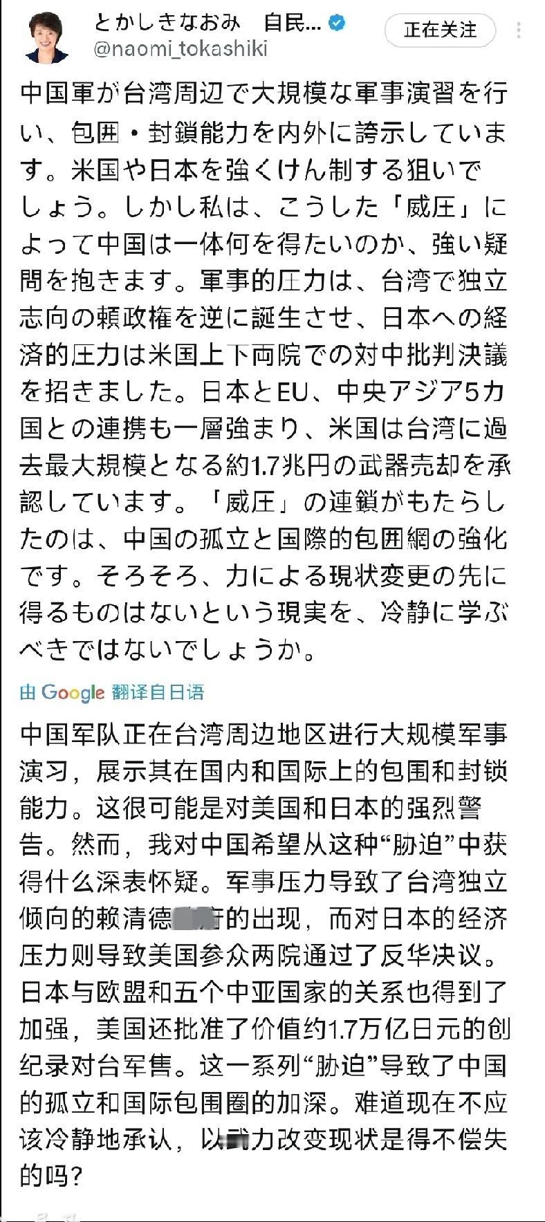 “缩头乌龟,不值一辩”的胡言乱语 个人观点:下方截图为日本前厚生副大臣,环境副大臣,众议员渡嘉敷奈绪美,昨晚(25年12月29日晚)社交媒体发文,文章内容请查截图,这里是简述。 简述如下:“宣传中国威胁,故加强日美欧合作,造成中国孤立及国际包围。” 个人认为:为什么日本让这个已经下了台的日本人发表言论?日本的政坛及日本的政府没有官方发表言论,只能偷偷摸摸,私底下用社交媒体,发表个人言论。个人认为就是因为“这个右翼分子说话不算数,胡言乱语,妖言惑众。” 发表的言论还是一如既往的日式套路“颠倒因果,混淆是非,倒打一耙,误导-绑架-煽动-挑衅-欺骗全球民意与舆论。” 个人认为:“不要口放嘴炮,满嘴谎言。不要把国内矛盾与压力,错误的引导到国际并不存在的问题中。”